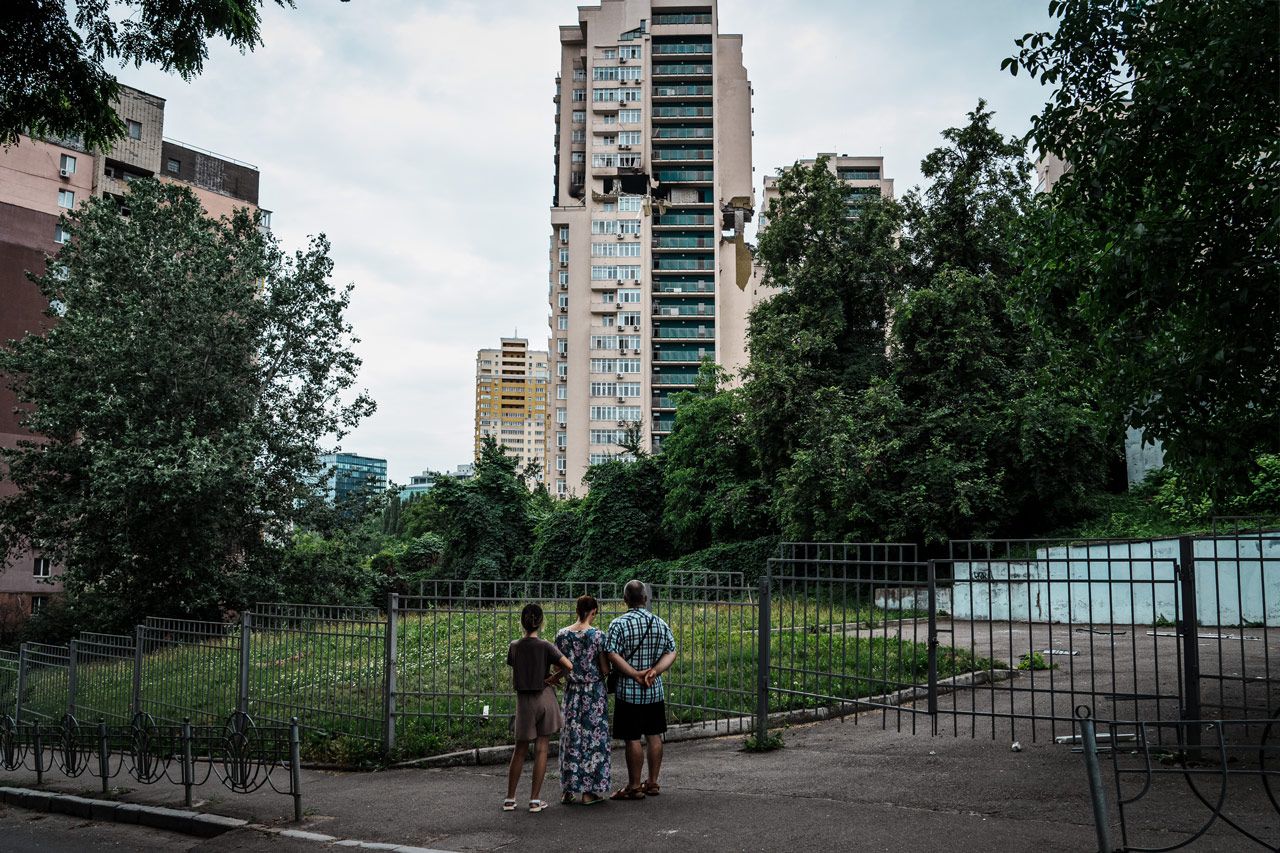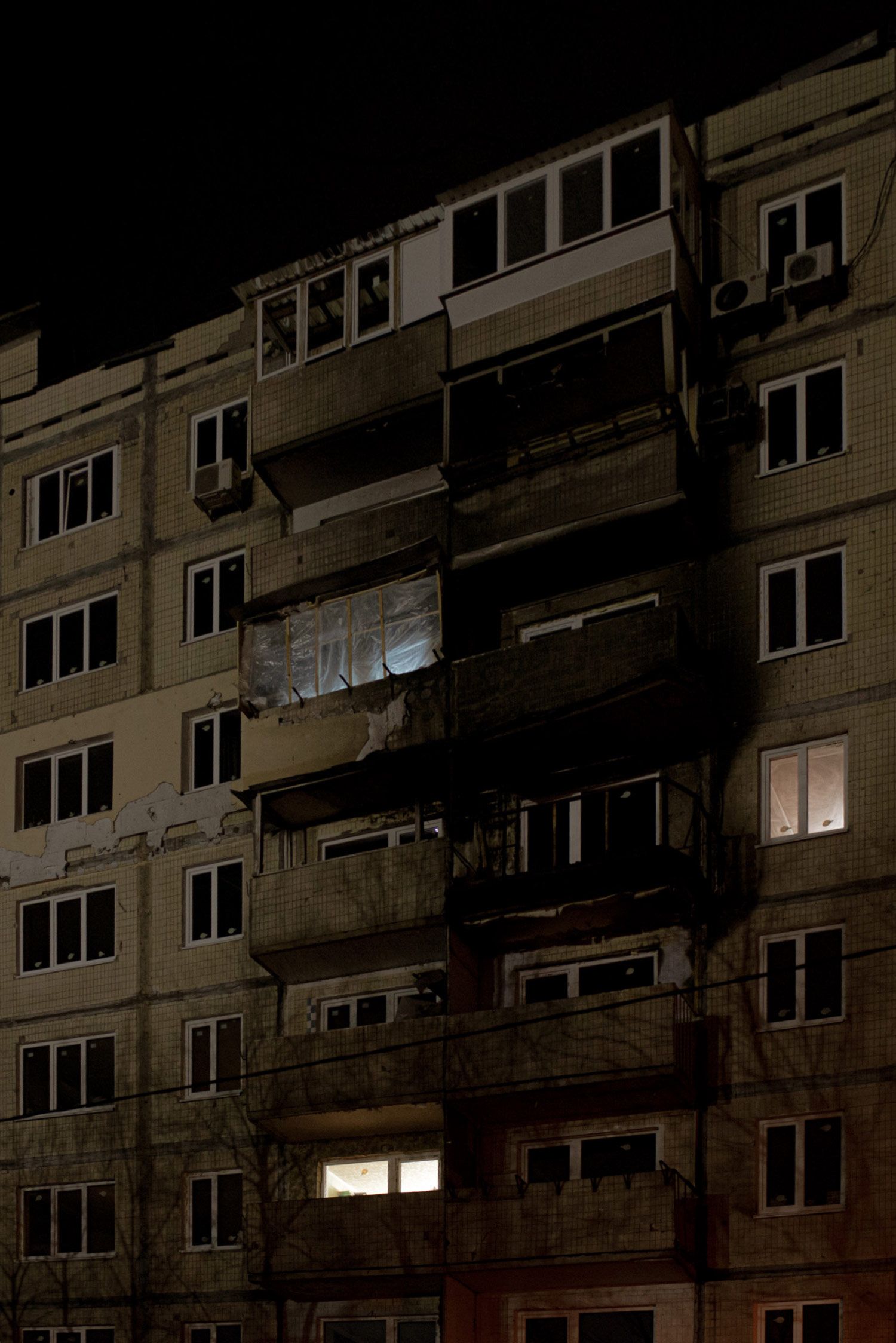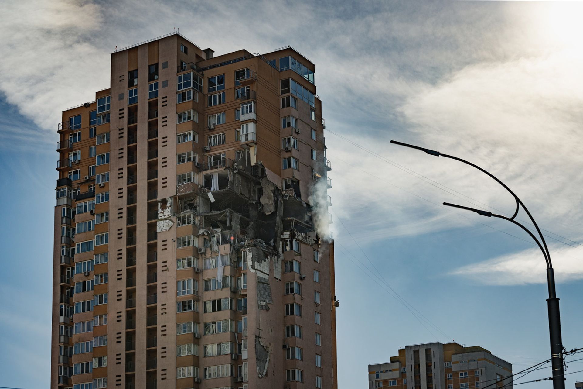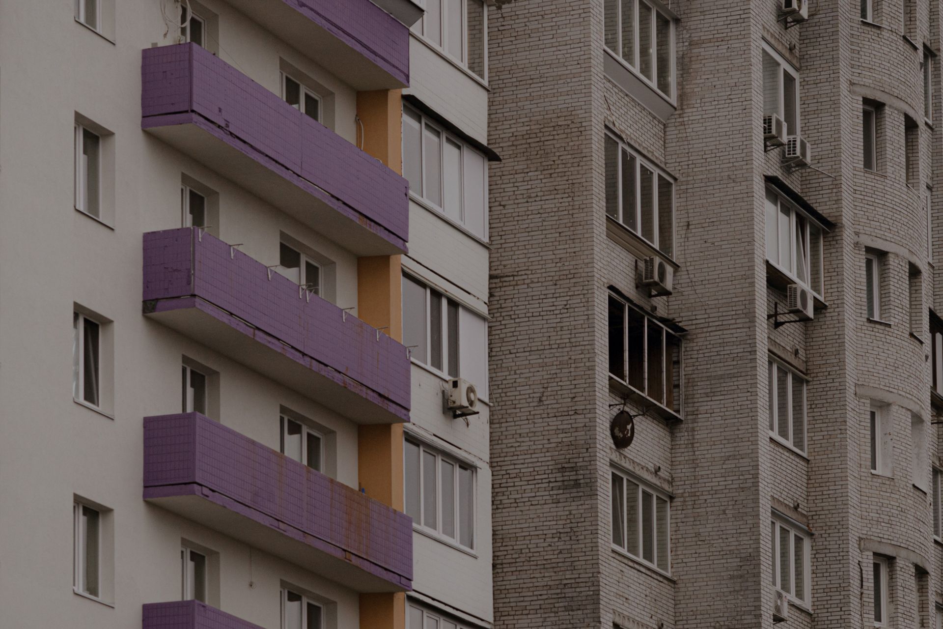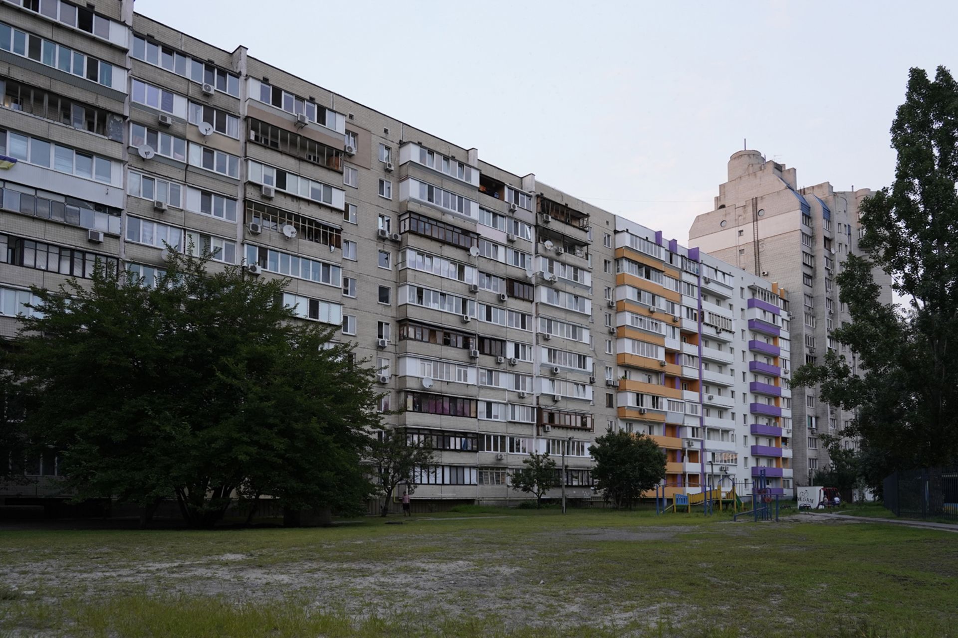 Жилую 25-этажку неподалеку от международного аэропорта «Киев-Жуляны» сдали в эксплуатацию в 2015 году. Во время полномасштабного вторжения она была повреждена одной из первых. Утром 26 февраля 2022-го ракета разрушила шесть угловых квартир на четырех верхних этажах (Россия утверждает, что это была ракета ПВО Украины, Украина это отрицает). Как пишет издание «Новини», основной удар пришелся по детским комнатам, которые, согласно планировке, располагались в этой части здания. Обошлось без жертв — многие жильцы к тому времени уже эвакуировались из города. Те, кто остался, жили в коридорах, соблюдая правило двух стен.