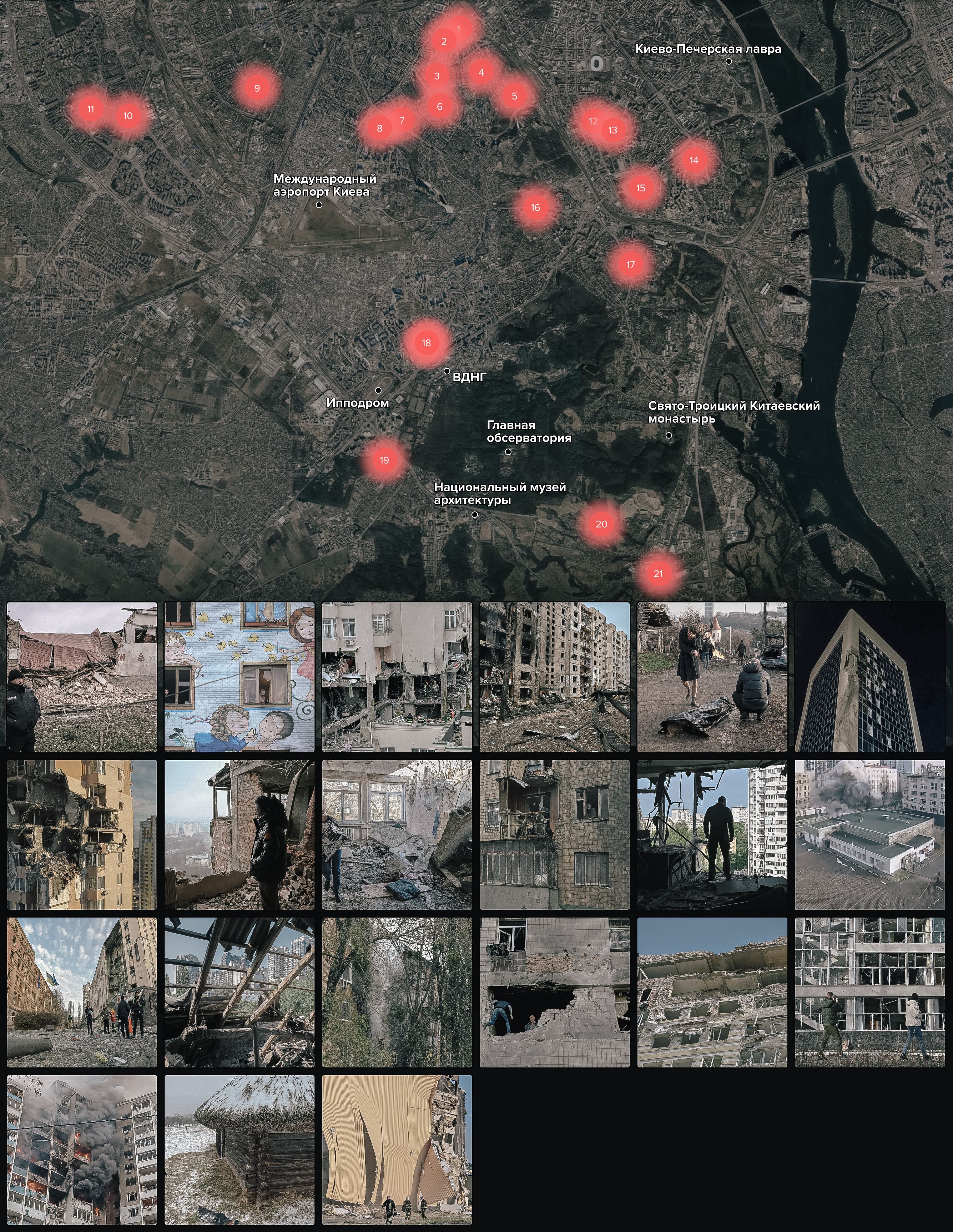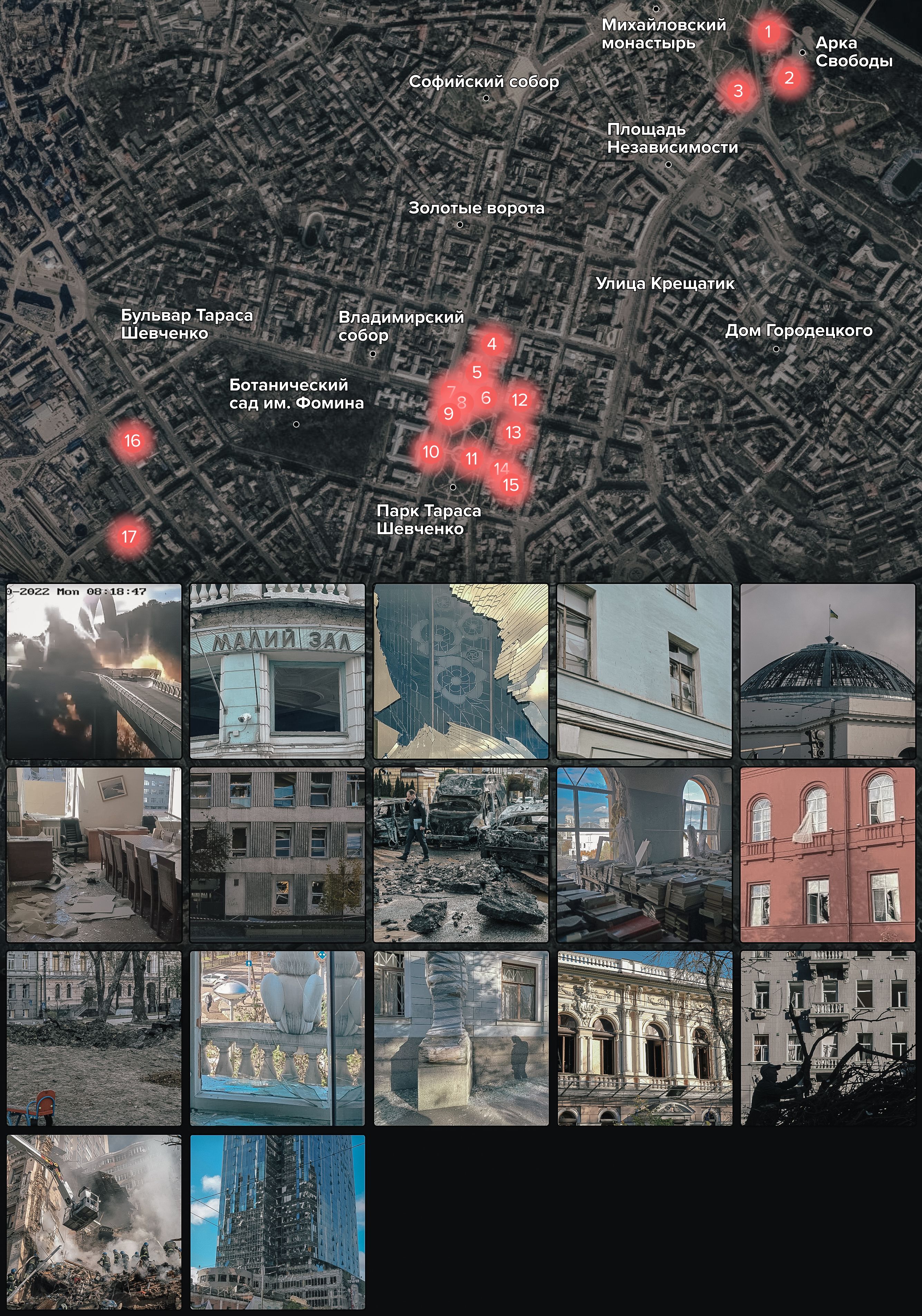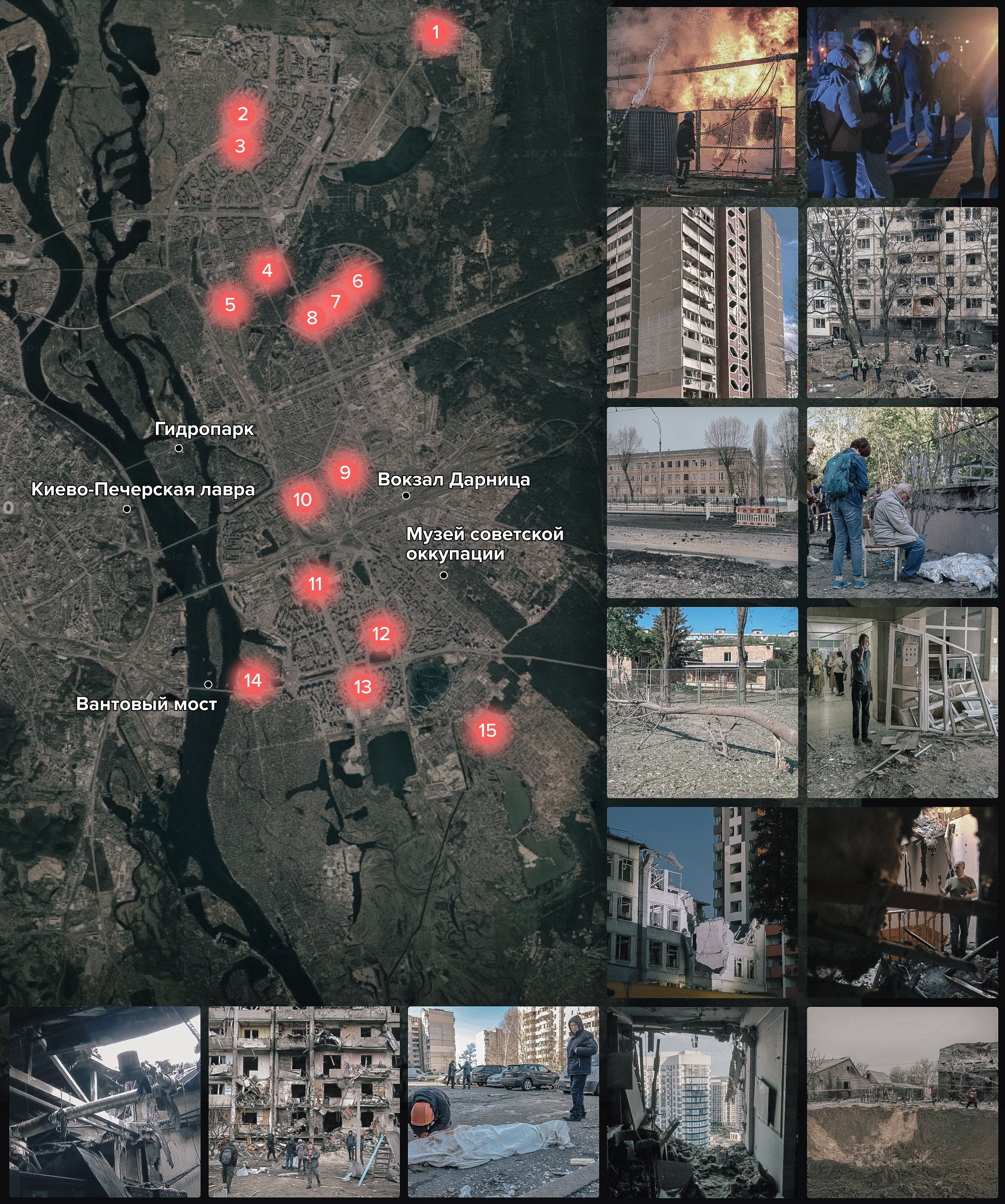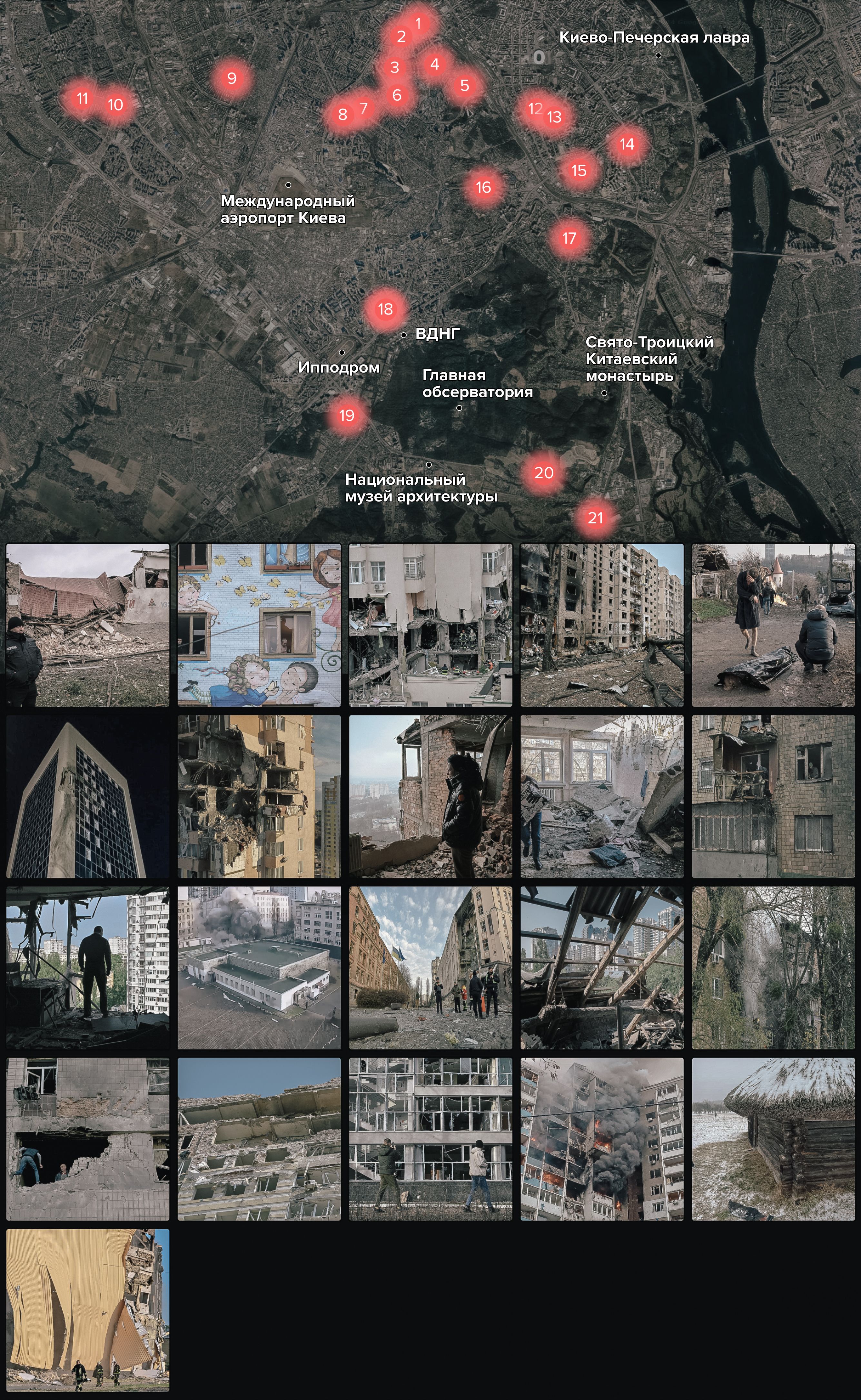 Как читать этот материал. Он разделен на четыре главы — четыре части города: центр Киева, левый берег Днепра, север правого берега, юг правого берега. Каждая глава начинается с карты разрушений — все места, поврежденные обстрелами, пронумерованы (нажмите на номер картинки на карте, чтобы узнать подробности). Также в тексте есть свежие фотографии этих мест и снимки разрушенных зданий, сделанные сразу после атак на город (чтобы их увидеть, разверните вкладку «Кадры из хроники»).