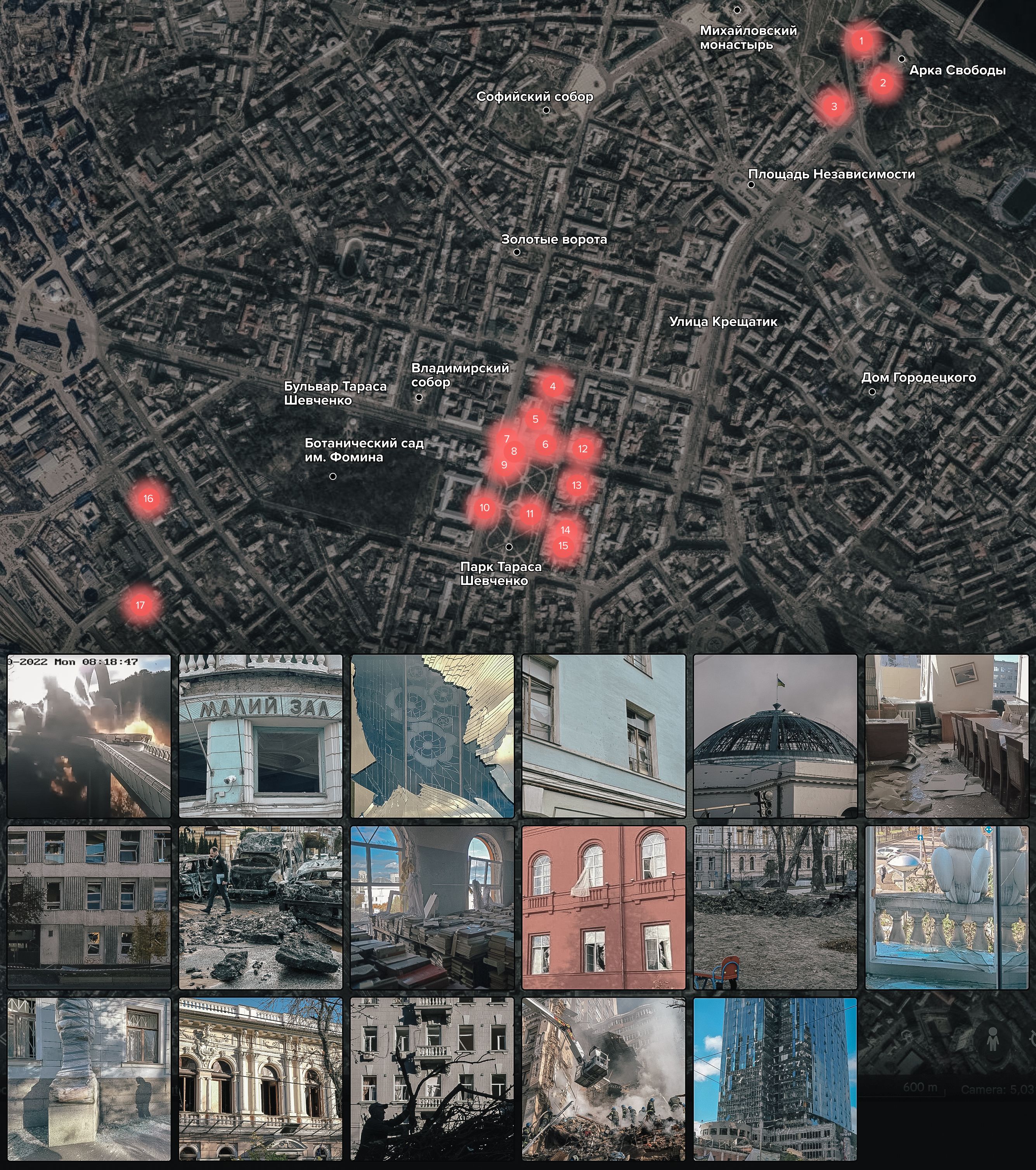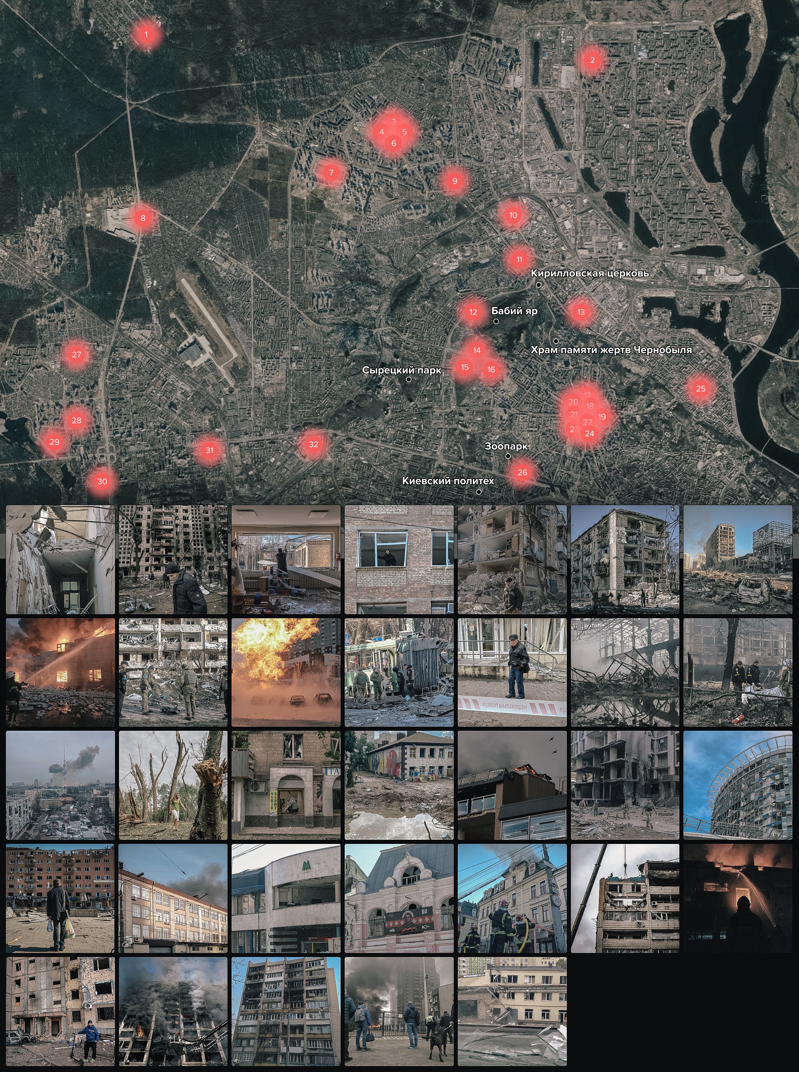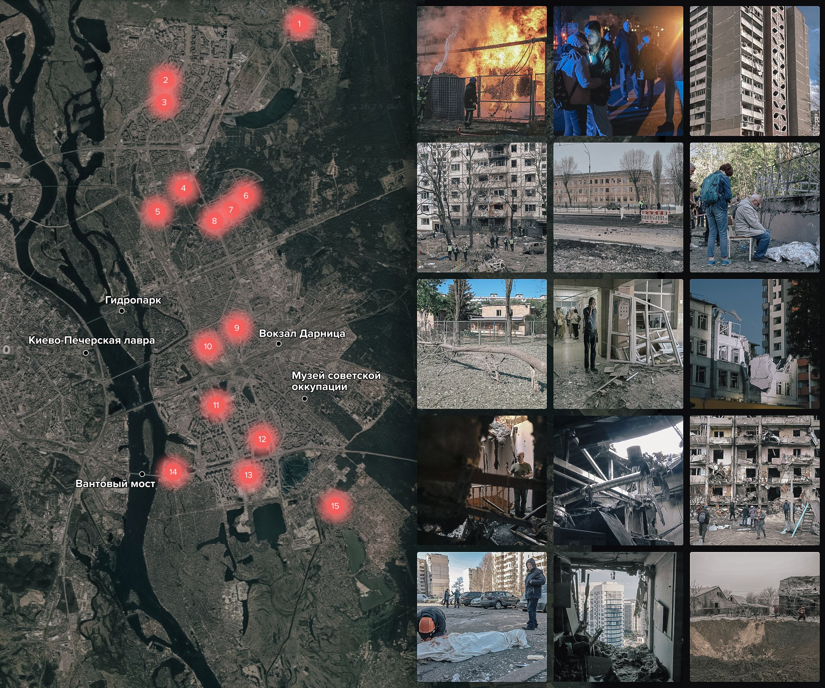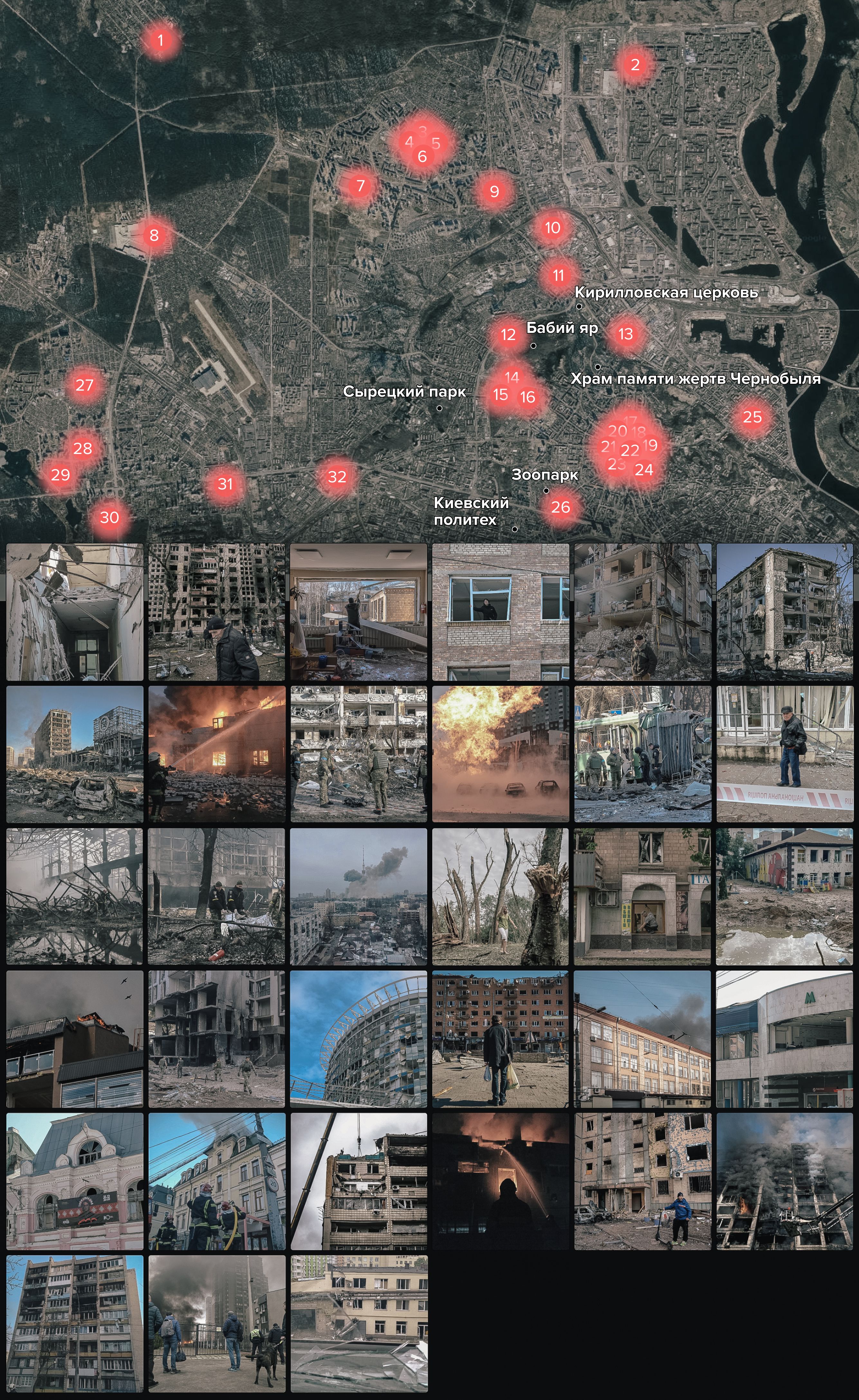 Как читать этот материал. Он разделен на четыре главы — четыре части города: центр Киева, левый берег Днепра, север правого берега, юг правого берега. Каждая глава начинается с карты разрушений — все места, поврежденные обстрелами, пронумерованы (нажмите на номер картинки на карте, чтобы узнать подробности). Также в тексте есть свежие фотографии этих мест и снимки разрушенных зданий, сделанные сразу после атак на город (чтобы их увидеть, разверните вкладку «Кадры из хроники»).