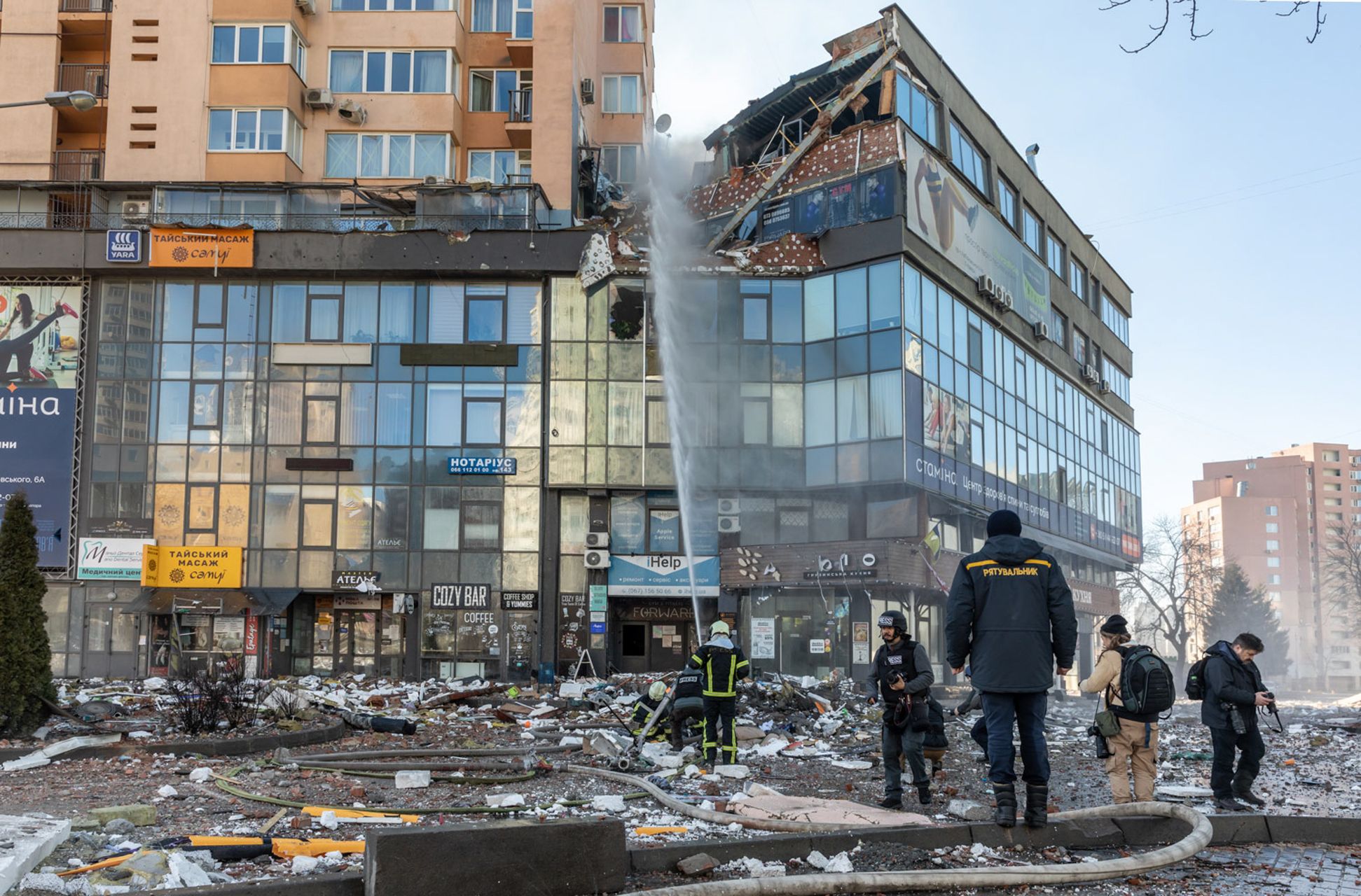 2 января 2024 года, ул. Елены Телиги, 41. Обломки российских ракет, сбитых силами ПВО, повредили витрины магазинов и почты на первом этаже жилого дома. Войска РФ использовали для массированного удара десятки дронов и ракет, большинство удалось сбить