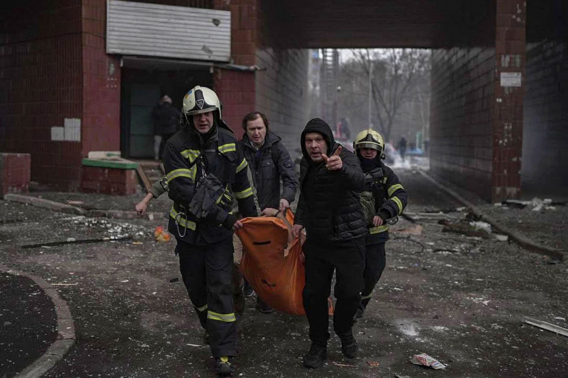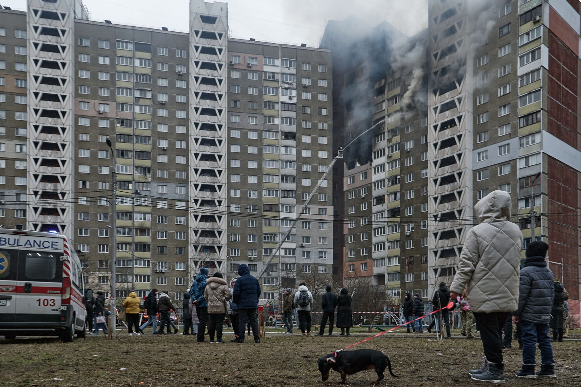 25 февраля 2022, ул. Александра Кошица, 7А. Первый жилой дом в Киеве, попавший под обстрел. Пострадали восемь человек. 150 жителей были эвакуированы