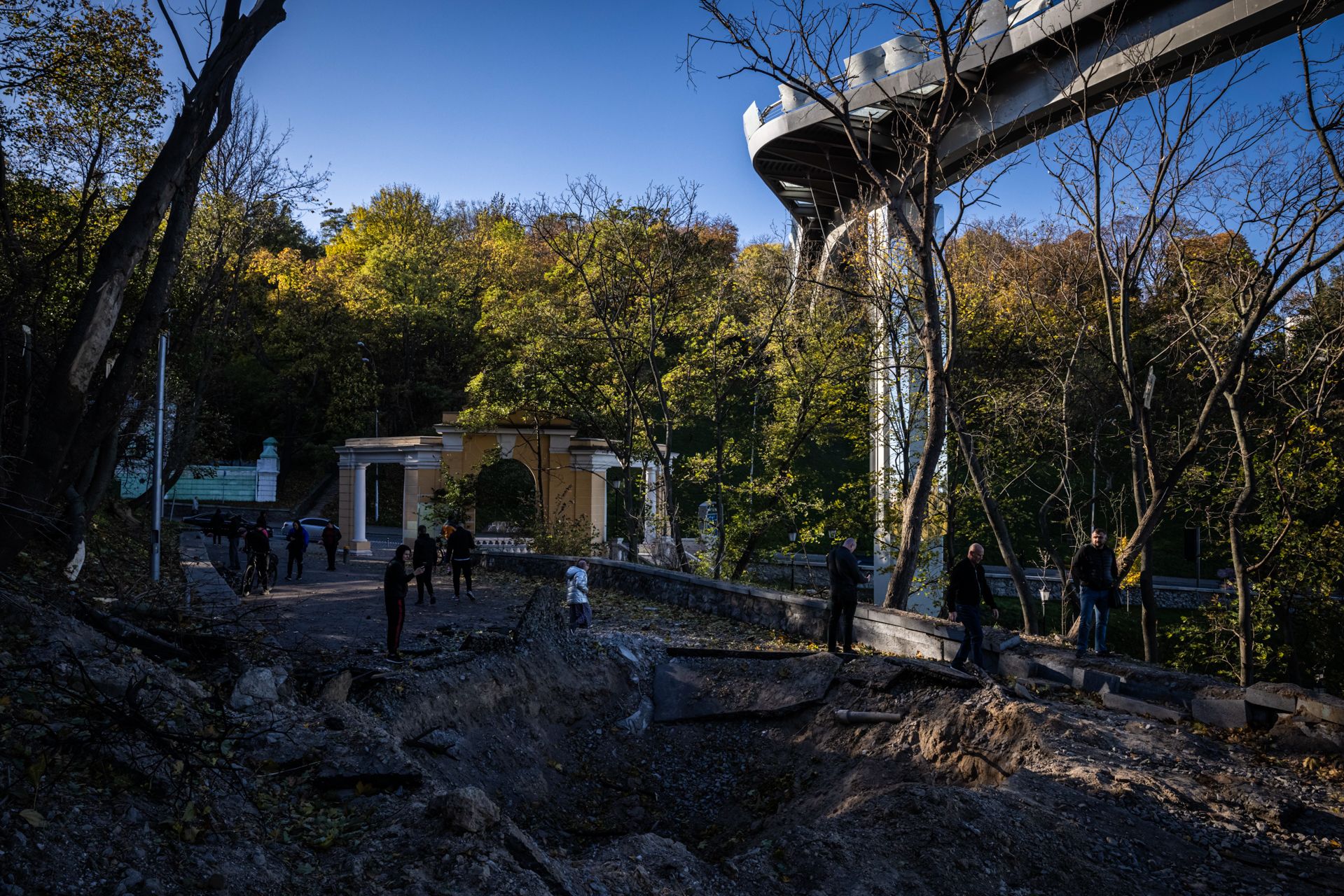 10 октября 2022 года. Ракета ударила рядом с пешеходно-велосипедным мостом через Владимирский спуск, известным как «мост Кличко»