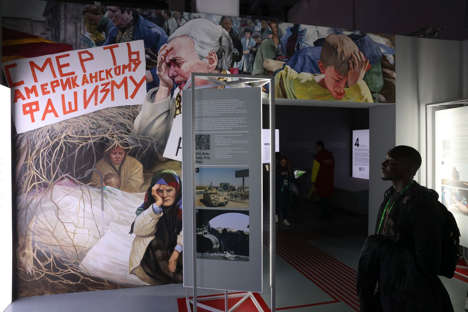 Getty Images Выставка «НАТО: история обмана. История зла» проходила в рамках Всемирного фестиваля молодежи и студентов в Сочи. Российские власти утверждают, что в нем приняли участие более 20 тысяч человек из 190 стран, включая якобы «делегацию граждан Украины». «По понятным причинам называть их официальной делегацией, показывать их [мы не можем], понимаем, что ребят ждет после этого уголовное преследование», — заявил заместитель главы администрации Путина Сергей Кириенко.Getty Images Всемирный фестиваль молодежи и студентов — нерегулярный форум, проводящийся с 1947 года международными молодежными организациями левого толка. В подавляющем большинстве случаев он проходил в странах с социалистическими режимами. СССР принимал мероприятие дважды — в 1957 и 1985 годах. Россия в последний раз принимала это мероприятие в 2017 годуGetty Images Свидетельства боевых действий в Донбассе, которые организаторы использовали в качестве экспонатов выставки о НАТО (несмотря на то, что ни один из участников войны в этом регионе в блок не входит)Getty Images Противотанковая управляемая ракета NLAW шведско-британского производства, стоящая на вооружении украинской армии. Их поставки начались в Украину незадолго до начала полномасштабного вторжения РФ Getty Images Организатор выставки — Музей современной истории России (в советское время он назывался Музеем революции). «Фактически проект показывает, что НАТО — абсолютно лицемерная организация, миролюбивая риторика которой идет вразрез с ее реальными делами», — заявила генеральный директор музея Ирина Великанова. Один из организаторов фестиваля, в свою очередь, заявил, что Россия сейчас «борется за справедливый мир». В ночь накануне открытия выставки в результате российского удара по Одессе погибло 12 человек, среди них пятеро детей