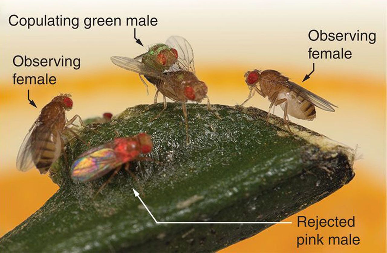 Ярче всего о силе конформизма для насекомых свидетельствуют недавние опыты на дрозофилах, проведенные энтомологами из Университета Тулузы. Оказалось, что при выборе половых партнеров самки дрозофил крайне чувствительны к тому, каких самцов предпочитают другие самки. В эксперименте молодые самки, помещенные в прозрачные шестигранные камеры, могли наблюдать за тем, каких партнеров выбирают самки, помещенные в соседние ячейки. В них, помимо самок, сажали пару искусственно окрашенных самцов, с одним из которых удавалось спариться. Если более удачливые самцы были окрашены, например, в зеленый, а менее — в розовый, то именно зеленых самцов предпочитали в дальнейшем самки, которые наблюдали за процессом.