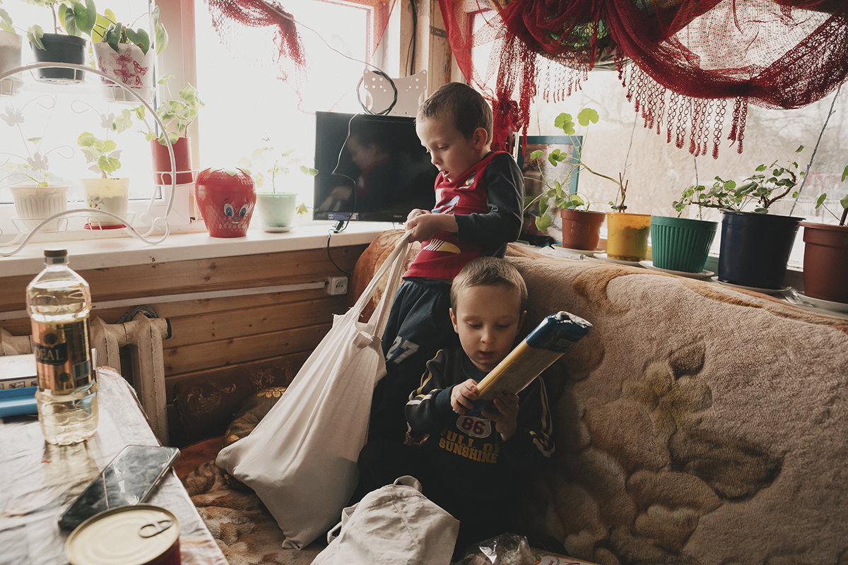 Кирилл и Никита (дети Екатерины) встречают волонтеровФото: Егор Гольдин Мальчишки разбирают на кухне сумку с продуктовым набором от благотворительного фонда «Банк еды “Русь”», шушукаются, хихикают про длинную макаронину и откладывают отдельно в сторону пачку спагетти. Я спрашиваю Екатерину, бывает ли, что приходится экономить на продуктах.