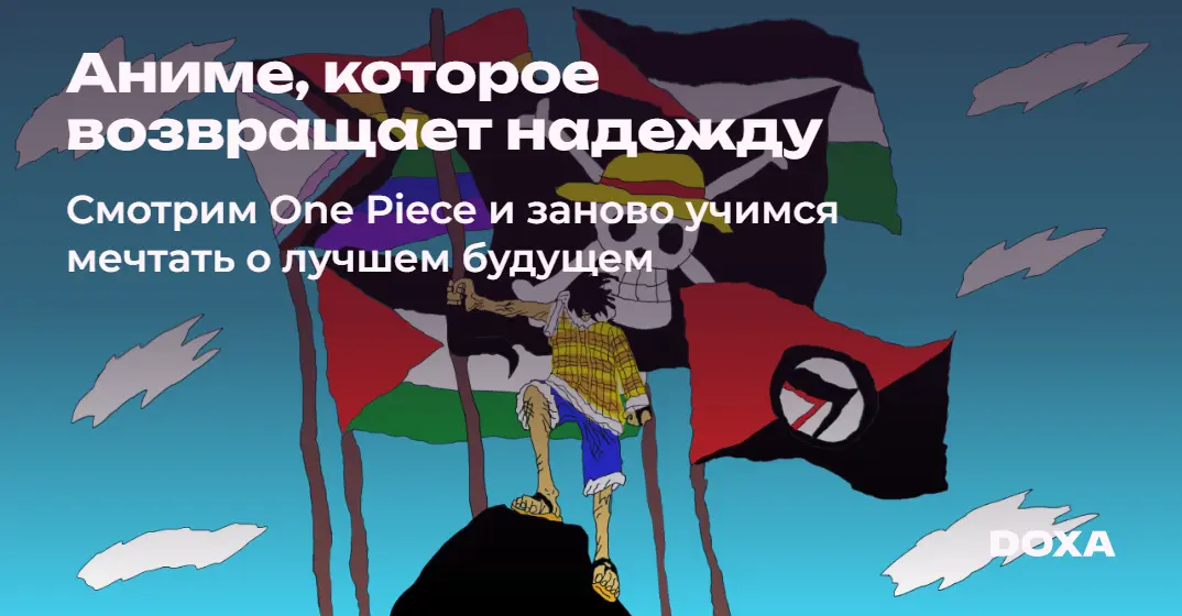One Piece — рисованная история о команде пирато:к, странствующих в поисках легендарного сокровища. За внешней мультяшностью их мира скрываются неравенство и диктатура, которым герои:ни One Piece противопоставляют стремление к свободе. Марк Рыбаков в колонке для DOXA разобрался, как One Piece возрождает в своих фанат:ках забытую веру в то, что лучший мир возможен. И почему это не просто бегство от реальности.