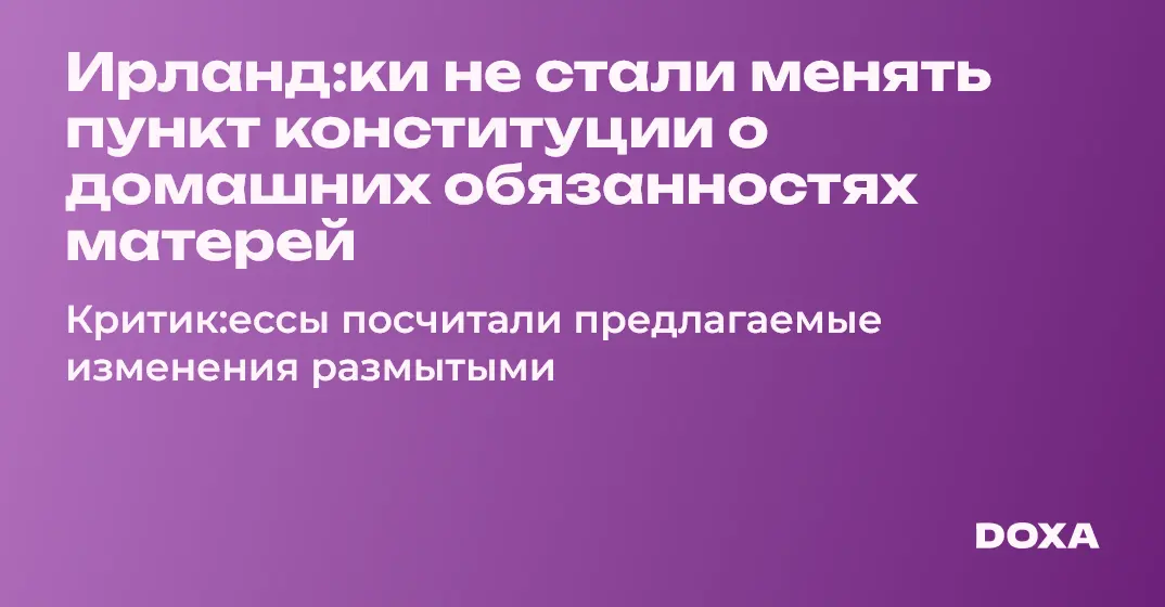 На референдуме в Ирландии проголосовавшие высказались против поправок в конституцию, расширяющих понятие семьи и изменяющих пункт о матерях и их домашних обязанностях. Поправка о роли женщин в семье касалась пункта конституции, по которому матери не должны быть принуждены работать, если это вредит их «домашним обязанностям»Article 41.2.2. The State shall, therefore, endeavour to ensure that mothers shall not be obliged by economic necessity to engage in labour to the neglect of their duties in the home. (Статья 41.2.2. Поэтому государство должно стремиться к тому, чтобы матери не были вынуждены в силу экономической необходимости заниматься трудовой деятельностью, пренебрегая своими обязанностями по дому.). Голосование прошло 8 марта, в Международный женский день.
