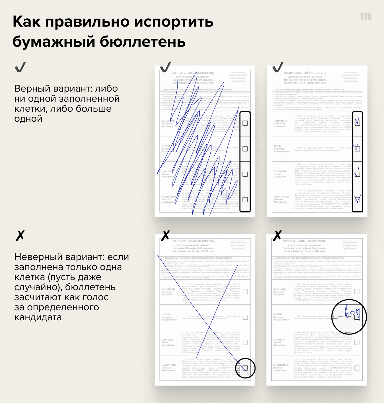 С 15 по 17 марта в России пройдут президентские выборы. Повлиять на главный их итог, разумеется, невозможно. Однако многие оппозиционные политики настаивают на том, что прийти на участок и выразить свой протест все равно важно. Мы собрали главные вопросы о предстоящих выборах. Как правильно испортить бюллетень? Может быть, эффективнее проголосовать за Даванкова или Харитонова? В какой день лучше посетить участок? Безопасно ли участвовать в акции «Полдень против Путина»? Что делать, если вас принуждают голосовать на работе — или пытаются задержать на участке? Как и где голосовать за границей? Ответы читайте в совместной инструкции «Медузы» и «ОВД-Инфо».