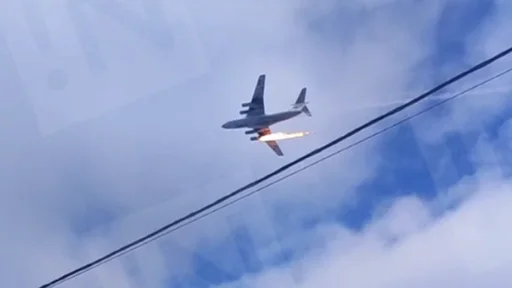 В районе 13.30 в соцсетях стали распространяться видео со снижающимся Ил-76, у которого заметно сильное пламя у правого двигателя. Самолет делает маневр разворота и снижается, в какой-то момент с крыла отваливается обгоревшая часть двигателя, на более поздних видео виден черный дым в районе аэропорта.