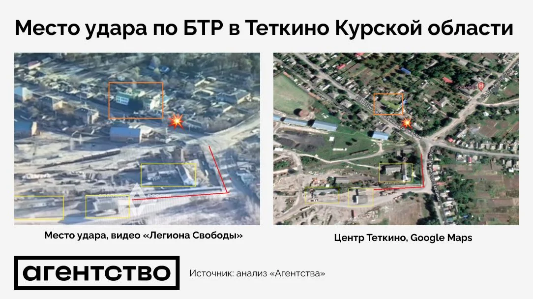 О перестрелке в Тёткино ранее сообщал и Илья Пономарев. Кроме этого, легион «Свобода России» заявлял, что ему удалось уничтожить российский бронетранспортер в посёлке. «Агентство» подтвердило, что кадры были сделаны в Тёткино на улице Ленина между домами 162 и 164. Расстояние от точки обстрела до границы с Украиной — 2 километра. Источник «Новой-Европа», близкий к силам операции, подтвердил уничтожение российского БТР.
