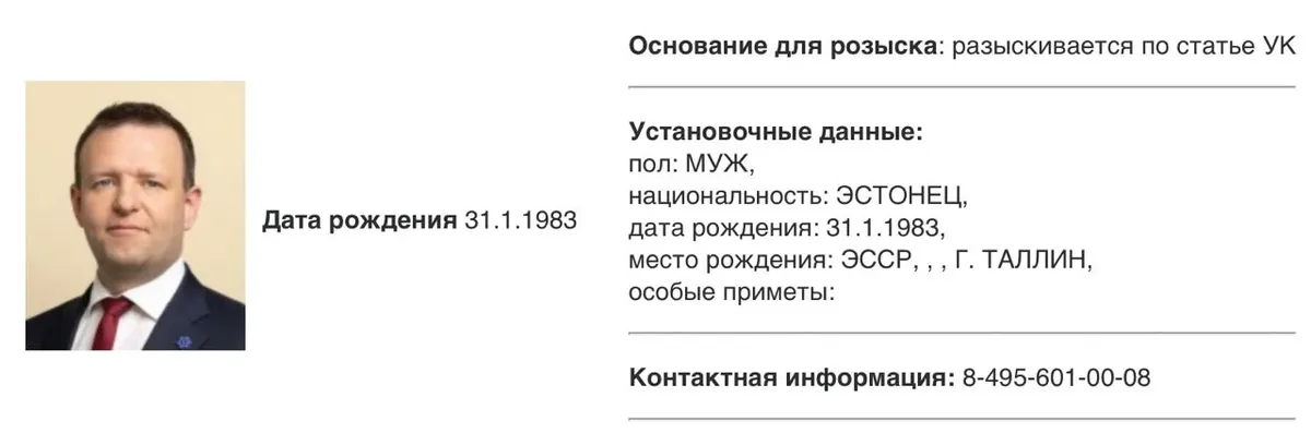 Карточка на имя Лаури Ляэнеметса появилась в розыскной базе ведомства. На сайте МВД сказано, что чиновник разыскивается по уголовной статье, по какой конкретно — не уточняется.