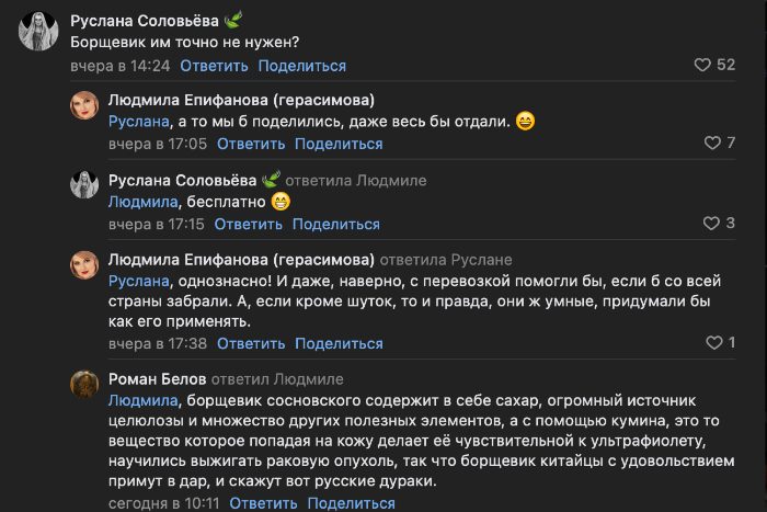 Через сутки комментарии все еще остались на странице губернатора, проверила «Бумага» . В частности, жители Ленобласти предлагают Дрозденко продавать Китаю борщевик вместо торфа.