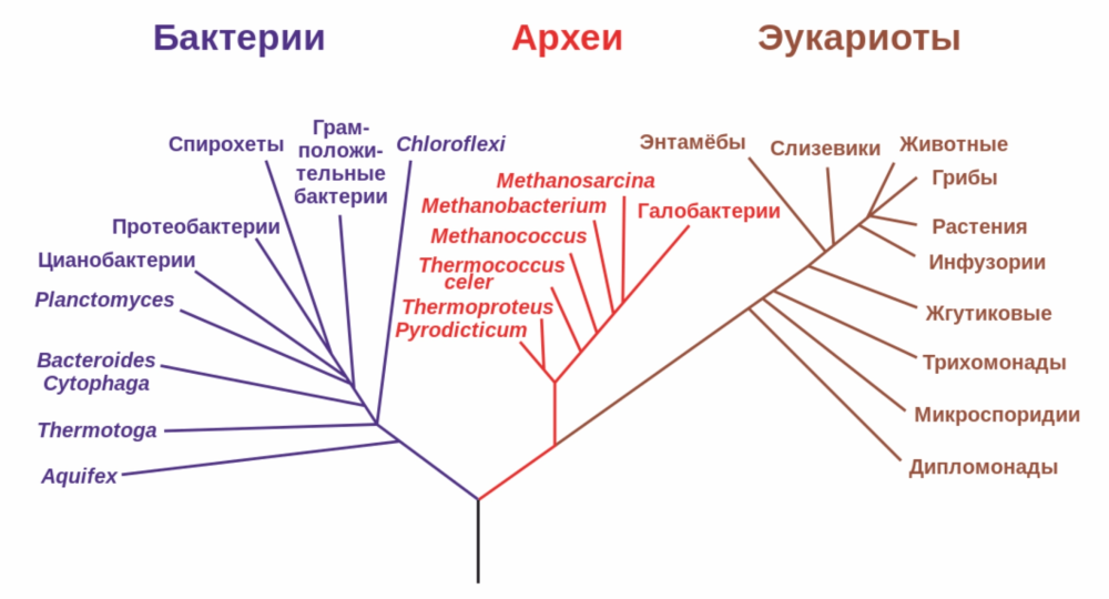 Это очень важное обстоятельство, потому что когда в учебниках, в книжках, да и во многих статьях показывают филогенетические деревья, то вместе с ними распространяют и суждение, что мы, эукариоты, происходим от архей. Первое филогенетическое дерево, которое было построено в таком виде из трех доменов жизни: от корня отходят бактерии, потом в другую сторону отходит некий общий ствол, и в какой-то точке от этого ствола отходят эукариоты и археи. Его построил где-то 45 лет назад великий пионер в области филогенетики Карл Вёзе (Carl Woese).