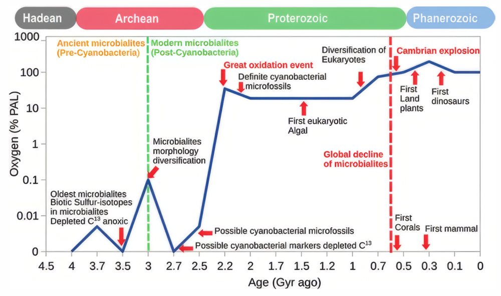 — Это интересный вопрос, на который вполне однозначного ответа нет, но какие-то осмысленные ответы мы всё же можем дать. Я подозреваю, что в этом деле замешана комбинация обоих этих обстоятельств. Одна, конечно, очень важная вещь — это то, что называется кислородной катастрофой — Great Oxygenation, возникновение фотосинтеза, именно того, что происходит при помощи хлорофилла у цианобактерий, — то, что называется oxygenic photosynthesis (кислородный фотосинтез). В течение первых двух миллиардов лет эволюции жизни кислорода в атмосфере было ничтожно мало — буквально доли процента от всей атмосферы.
