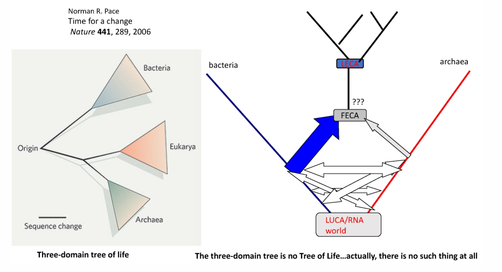 Эта трехдоменная модель эволюции жизни, где эукариоты группируются с археями, оказалась выдающимся достижением. Но дальнейшее развитие показало, что изначальные три домена исключительно однобоко отражают историю жизни. А ежели на дерево смотреть глубже, то выявляются два принципиальных аспекта, по которым оно представляет собой недопустимое упрощение.