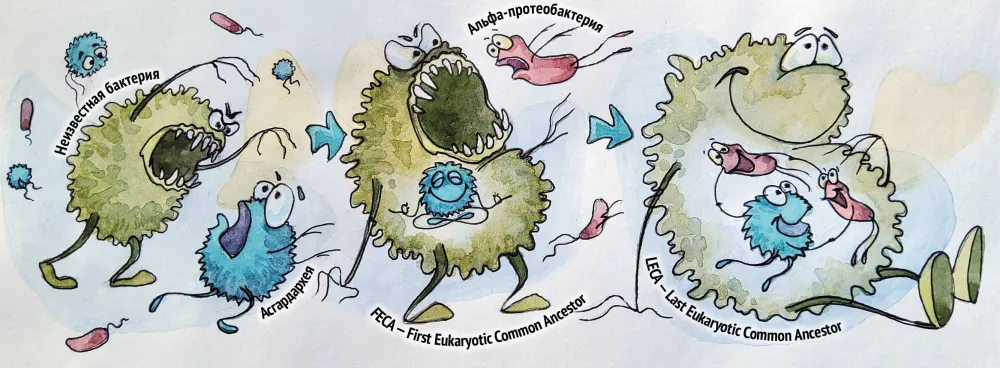 Тут уже сказывается то, что, во-первых, мы на самом деле не знаем, когда появились самые первые эукариоты, сколько было «попыток» возникновения. Давайте мы тут упомянем такую интересную вещь, которую те, кто этой темой не занимаются, может быть, не осознают полностью: прокариоты, бактерии, археи почти никогда не живут одни. Они образуют то, что называется консорциумами — достаточно сложные экосистемы, сообщества, где тесно взаимодействуют между собой разные виды, часто очень разные прокариоты, в частности, археи с бактериями. Есть такие экстремальные места на планете — какие-нибудь горячие источники или суперсоленые озера, где могут жить, скажем, только археи. Но это ситуации экстремальные. А в ситуациях более нормальных они живут вместе. И, кстати (наверное, стоило упомянуть об этом раньше), эти самые асгардархеи очень любят образовывать консорциумы и живут вместе с бактериями, с которыми у них есть некоторая координация метаболизма. В частности, с дельта-протеобактериями, про которые есть основания думать, что, может быть, в этом эндосимбиозе они были на самом деле первичными хозяевами. Сейчас мы видим консорциумы, где они с асгардархеями вообще буквально переплетаются — картинки красивые, — но внутрь все-таки они не проникают. Ну вот в каких-то редких обстоятельствах возникает серьезный конфликт, после которого выжить непросто. Но когда-то они, видимо, могли и заглатывать друг друга. Я сейчас думаю, что более вероятно то, что именно бактерии заглатывали археи, но уверенным полностью в этом быть нельзя.