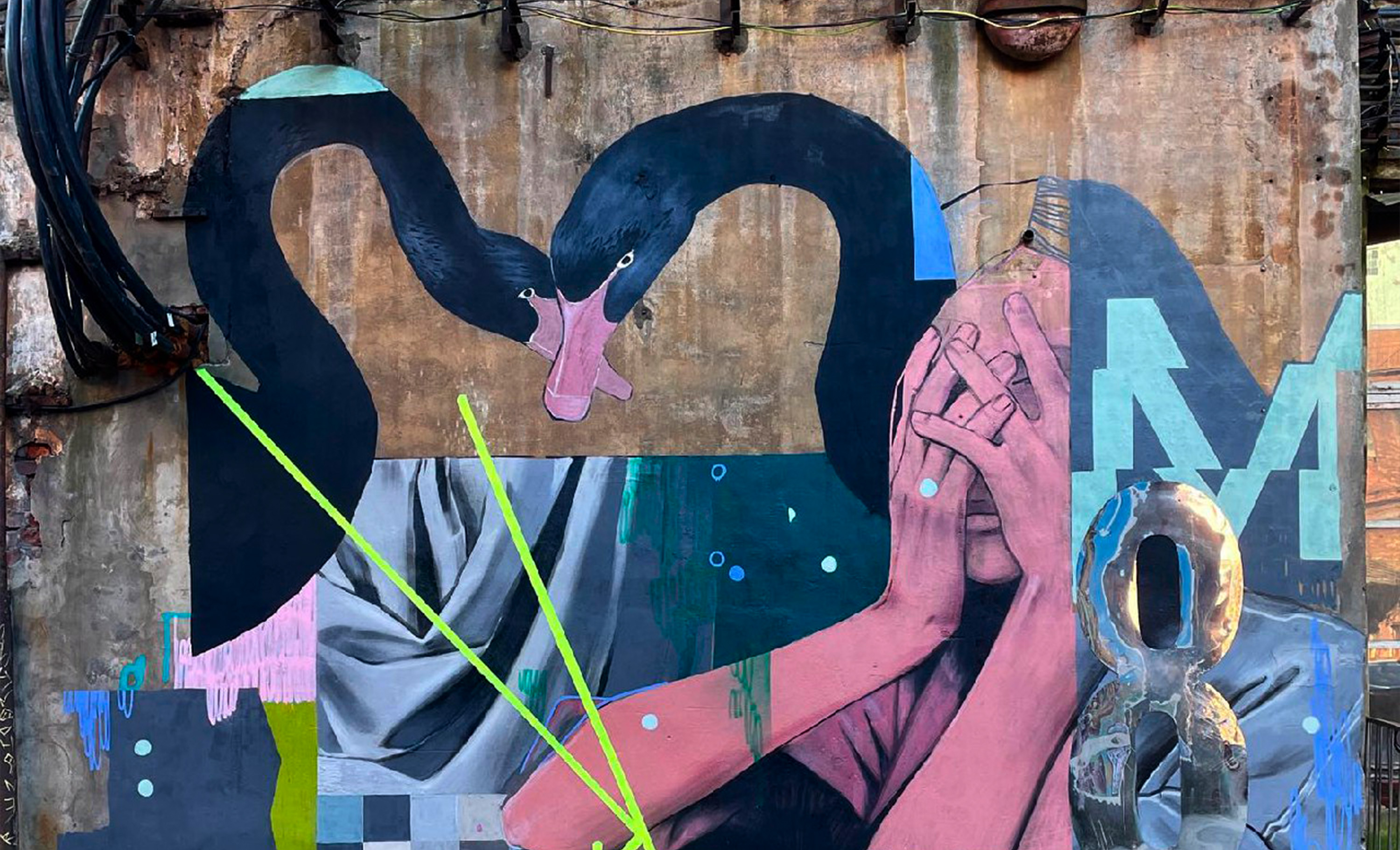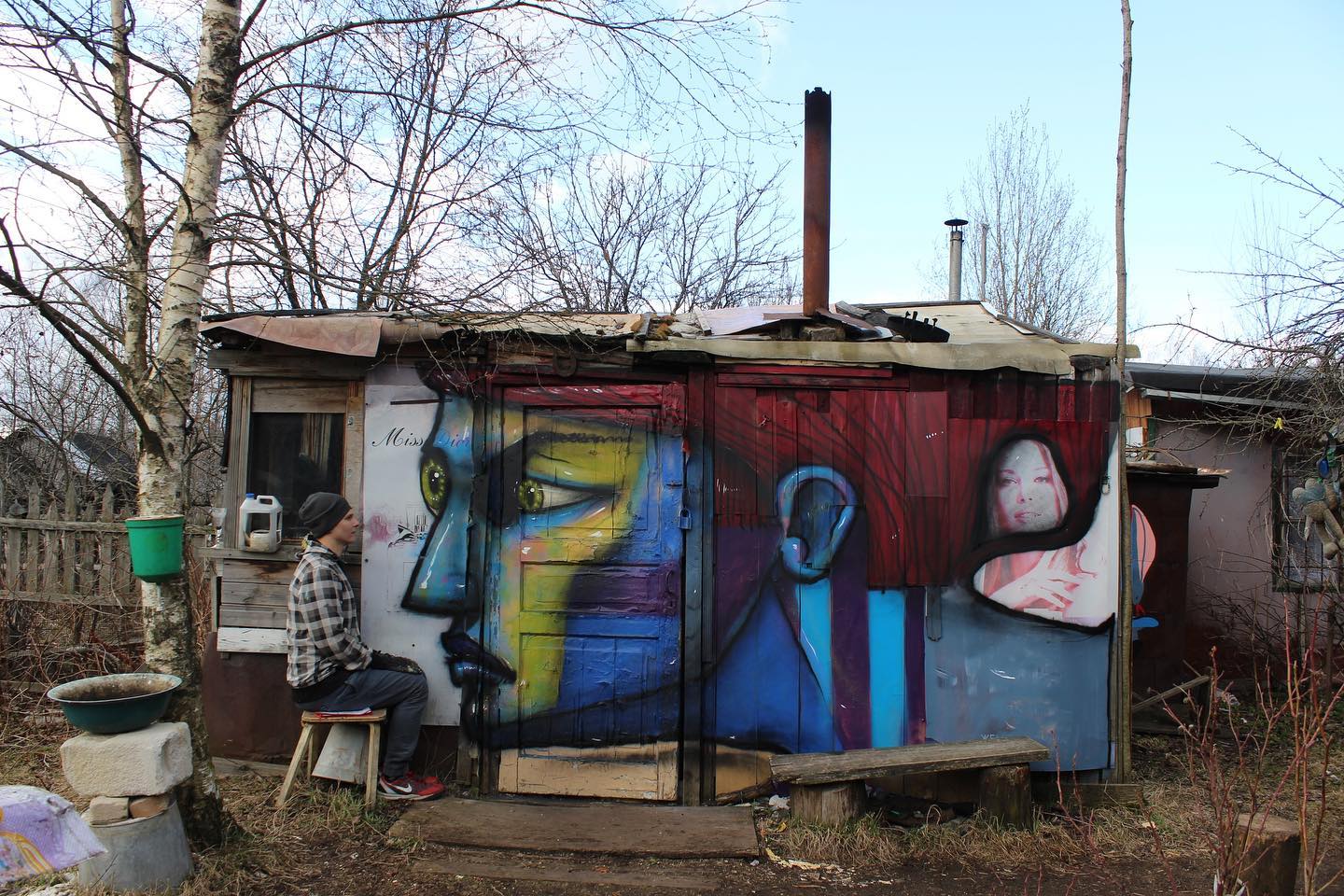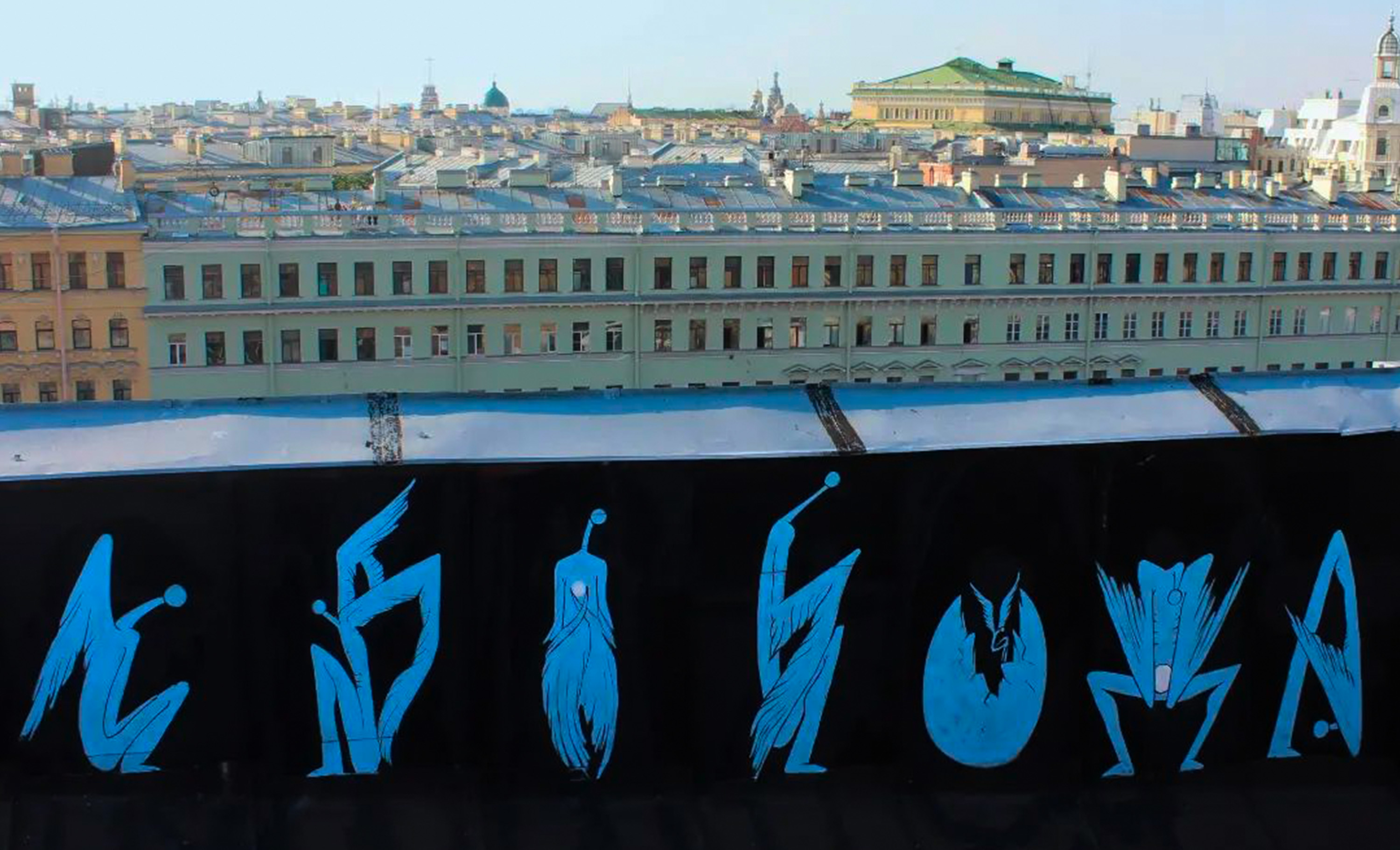 В прошлом году художники создали антивоенную инсталляцию на арке бывшего Дома культуры. Работа под названием Russian Cyberpunk представляла собой силуэты трех мужчин, у которых на месте конечностей были приделаны белые протезы, расписанные голубыми цветочными орнаментами под гжельскую роспись. Ее тоже быстро закрасили.