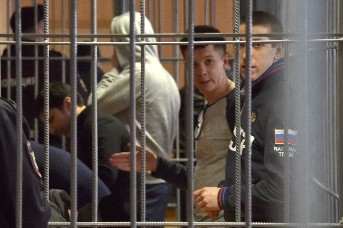 Захарий Калашов, известный как вор в законе Шакро Молодой, обвиняемый в вымогательстве, в зале заседаний Тверского суда Москвы, 13 июля 2016 года. Фото: Дмитрий Коротаев / Коммерсантъ / Sipa USA / Vida Press