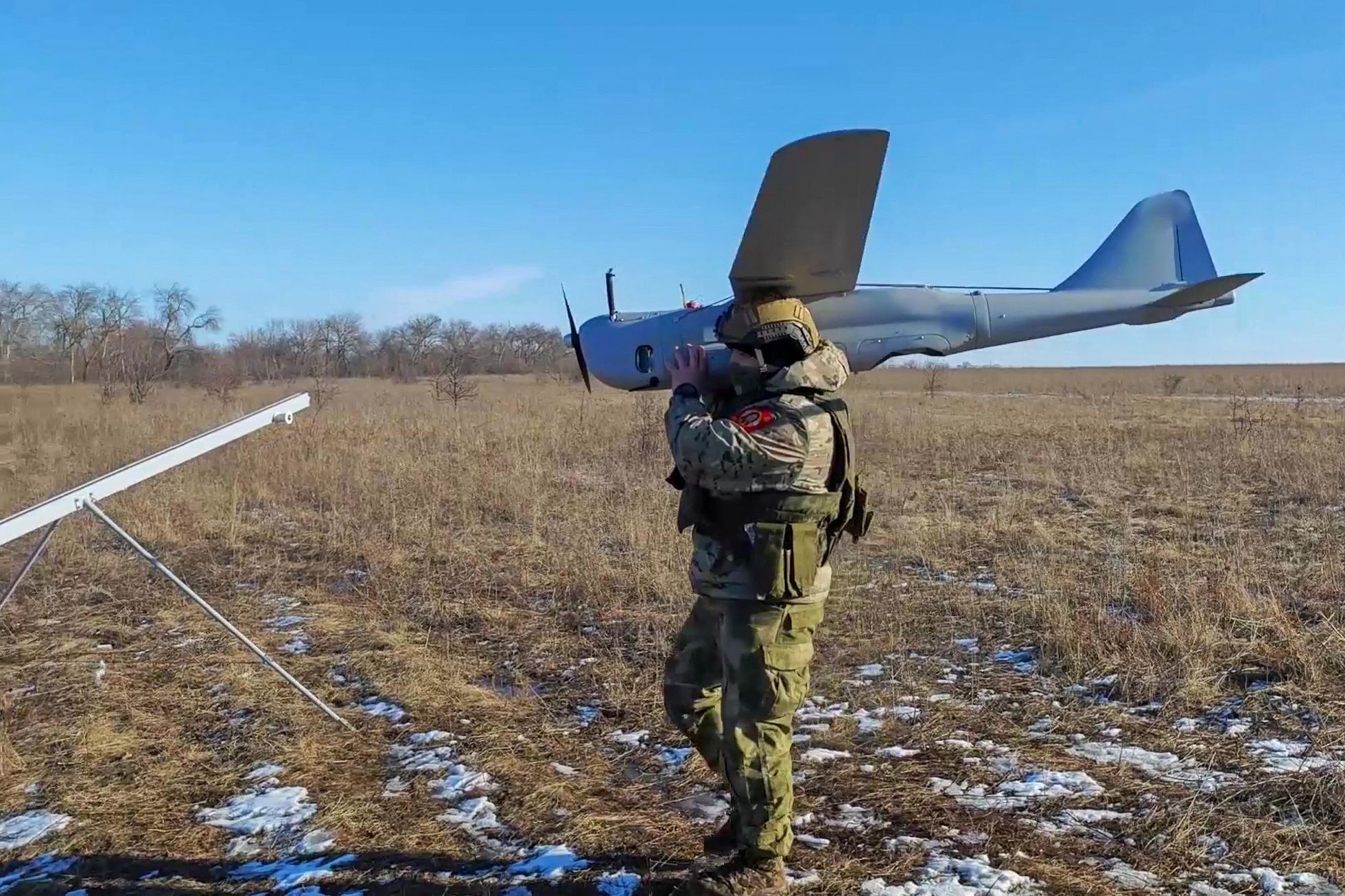 - Специально произведенные разведывательные дроны большей — по сравнению с коммерческими — дальности. Российское командование до войны считало, что подобных дронов, прошедших многолетние испытания в войсках, которые имеют защищенные каналы связи и управления, будет достаточно для ведения боевых действий. Предполагалось создать на их основе «разведывательно-огневые контуры»: грубо говоря, дрон (например, «Орлан» самолетного типа) должен выявлять цели и давать целеуказание для артиллерии для их поражения. Кроме прочего, часть дронов имела системы лазерной подсветки целей для использования совместно с высокоточными управляемыми снарядами «Краснополь» калибра 152 миллиметра. Предполагалось, что такие дроны позволят наносить точные удары на глубину в несколько десятков километров. БПЛА были приданы артиллерийским подразделениям и соединениям и вышестоящим штабам.