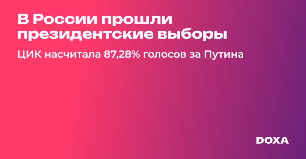 После обработки 100% протоколов российская ЦИК сообщила, что Владимир Путин набрал 87,28% голосов. Глава ЦИК Элла Памфилова также сообщила о «рекордной в новейшей истории» явке на выборы в 77,44%.