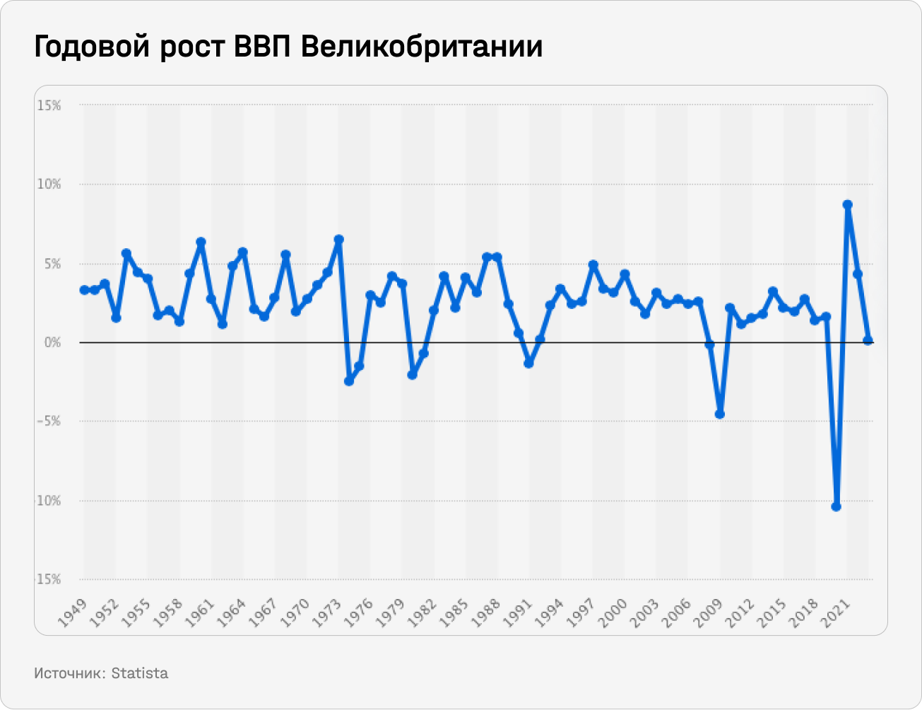 По экономике страны сильно ударила пандемия. В 2020 году Великобритания пережила крупнейшее падение ВВП в своей истории — на 10,4%. Дальше начался период восстановления, а темпы экономического роста были относительно высокими — 8,7% в 2021 году и 4,3% в 2022 году. Однако в 2023 году этот процесс явно застопорился.