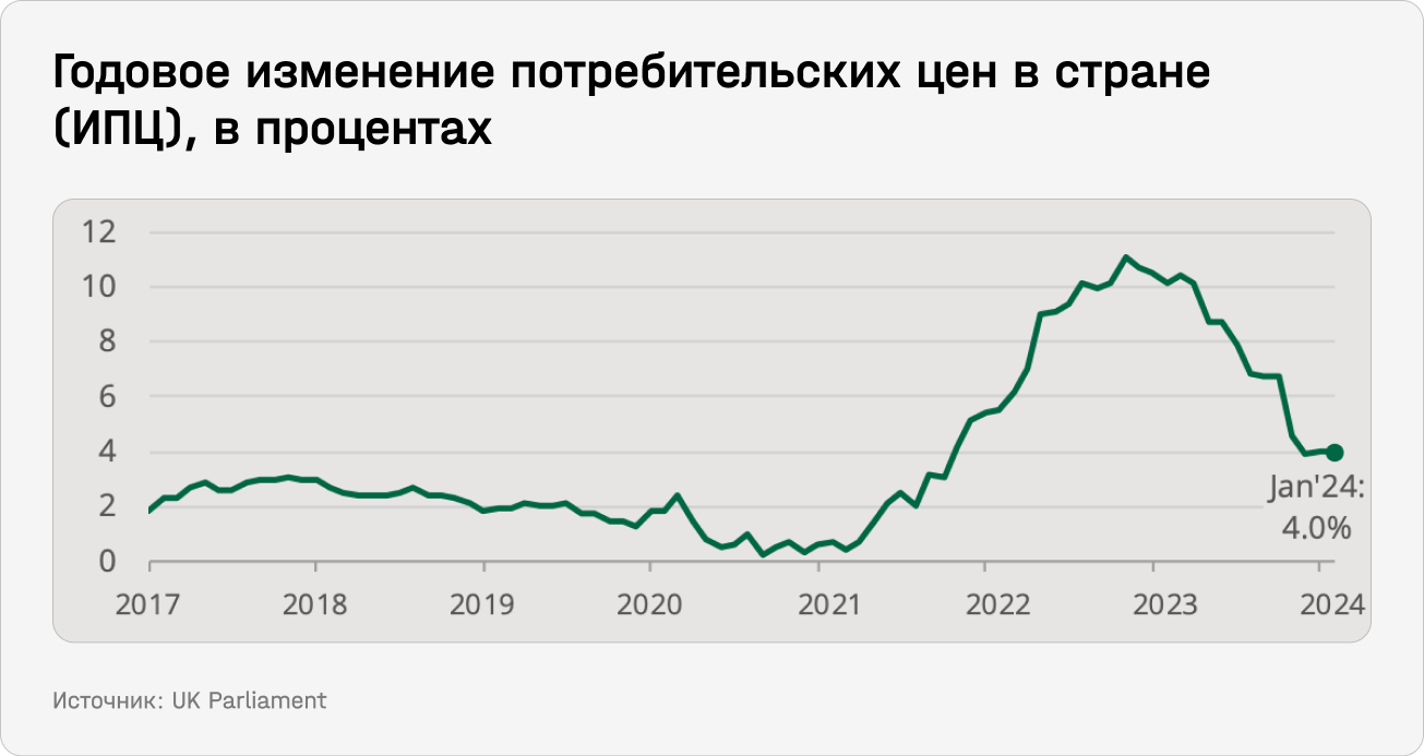 - Устойчиво высокая инфляция. В октябре 2022 года инфляция достигла максимальных за 41 год 11,1%. После этого ее уровень начал падать — и ожидается, что продолжит идти вниз в 2024 году. Банк Англии ожидает, что инфляция достигнет целевого показателя в 2% в последнем квартале 2026 года.