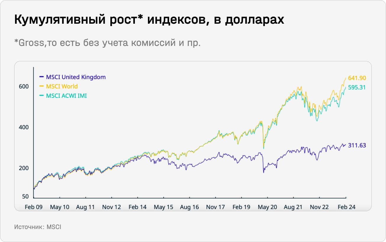 Индекс MSCI UK, который состоит из 83 британских компаний средней и крупной капитализации, покрывающий примерно 85% рыночной капитализации страны с поправкой на free float, тоже существенно отставал от глобальных индексов MSCI World и MSCI ACWI.