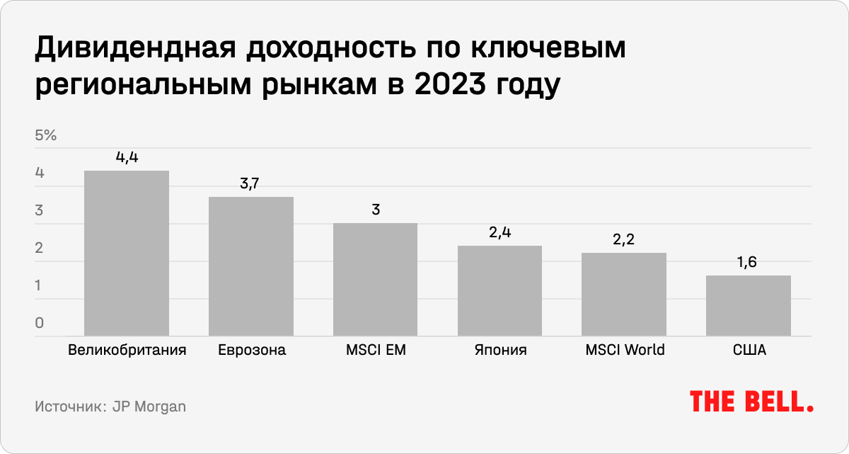 2. Высокая дивидендная доходность. Британские компании отличаются более консервативным подходом к аллокации капитала. Благодаря этому они могут предложить гораздо более высокую дивидендную доходность по сравнению с другими странами. По данным Bloomberg, в 2023 году этот показатель в Великобритании составил 4,4%. Для сравнения, у США он почти в три раза ниже — около 1,6%, отмечают в JP Morgan.