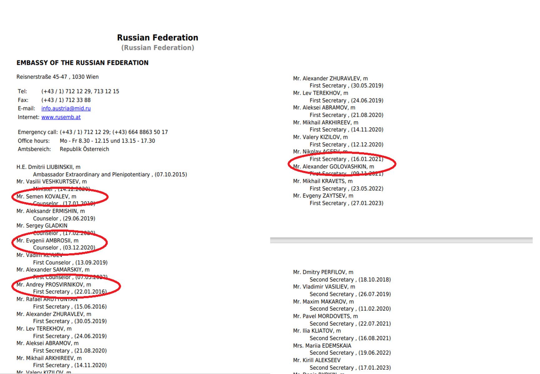 На официальном сайте посольства РФ в Австрии указаны только 10 дипломатов, хотя под крышей особняка на Райзнерштрассе работают 46 человек с дипломатическими паспортами — и это не считая технический персонал, водителей, поваров и т.д. С 2015 года дипмиссию возглавляет германист Дмитрий Любинский, чей отец, Евгений Любинский, много лет шпионил в Европе под «крышей» советского внешнеторгового предприятия «Автотракторэкспорт».