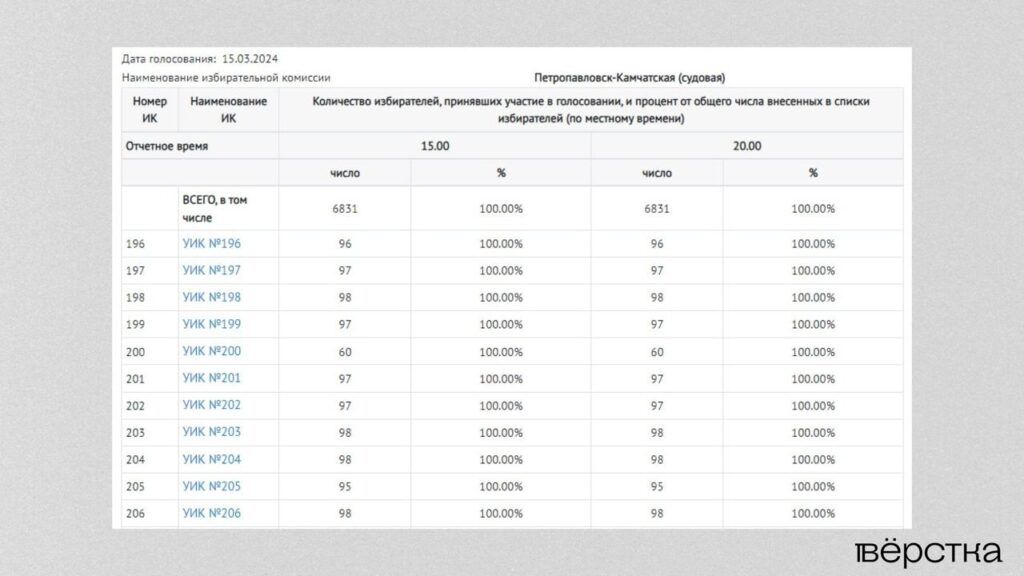 Редакция «Вёрстки» 15 марта 2024 |Следует из данных избиркомов Приморья, Камчатки, Чукотки, Магаданской области и Сахалина