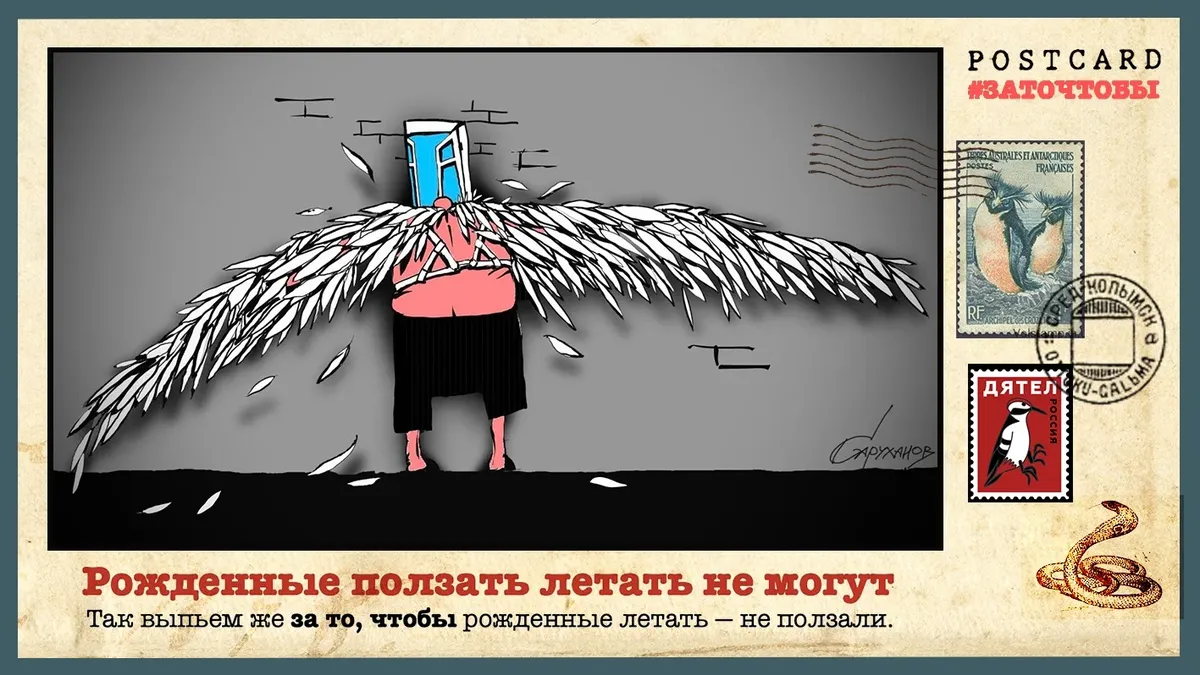 Дата16.03.2024АвторСергей МостовщиковИсточникНовая ГазетаСохранённая копияInternet ArchiveOriginal MaterialShow translationРожденные ползать летать не могут…Открытка из рубрики Сергея Мостовщикова и Петра Саруханова #заточтобы Петр Саруханов / «Новая газета» Рожденные ползать летать не могут. Так выпьем же за то, чтобы рожденные летать — не ползали.