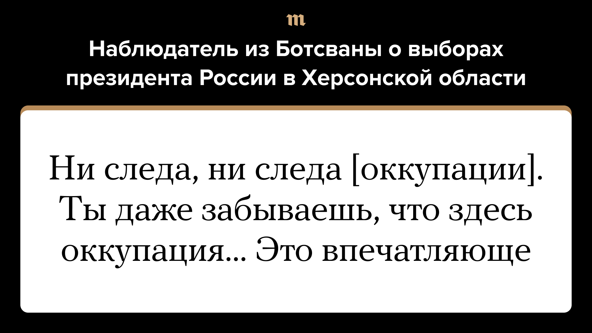 Российское пропагандистское агентство РИА Новости опубликовало видео с избирательного участка в Херсонской области, на котором проводят голосование на выборах президента РФ. В ролике мужчина, названный наблюдателем из Ботсваны, рассказывает, что очень доволен организацией голосования и не замечает следов оккупации региона российскими войсками. Он утверждает, что местные жители с радостью приходят и голосуют, а обстановка на участке и вокруг мирная.