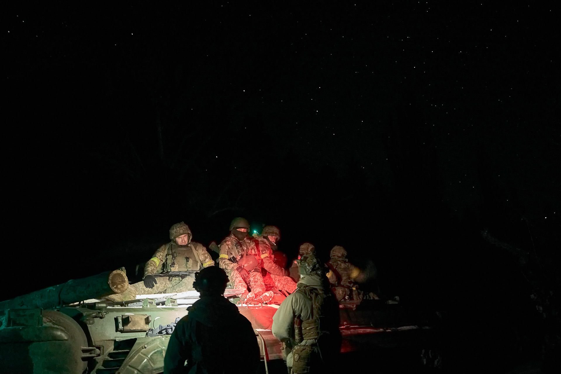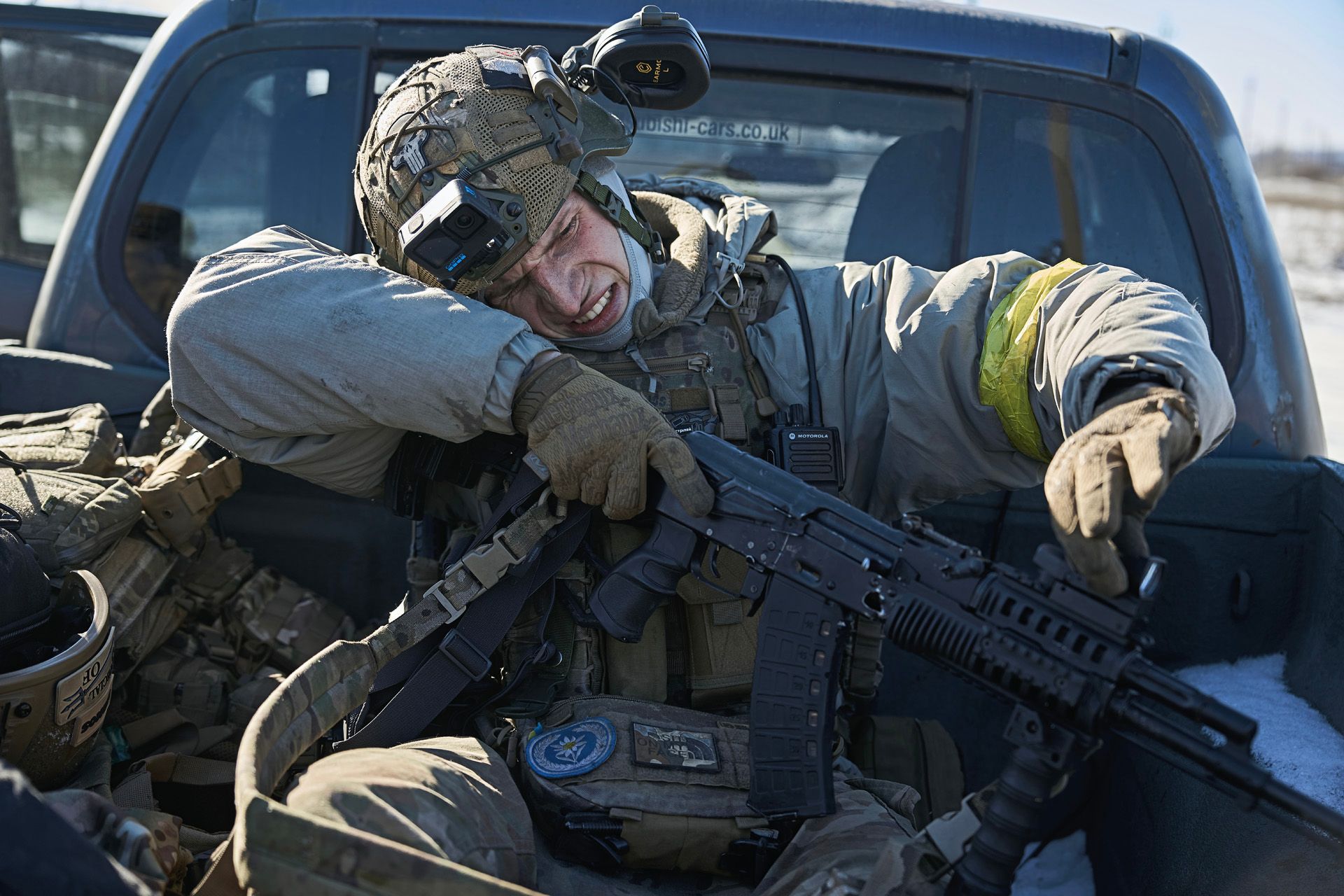 Kostiantyn Liberov / Libkos / Getty Images Бойцы «Эдельвейса» осматривают повреждения, полученные одним из них во время штурма российских позиций в лесу под Синьковкой