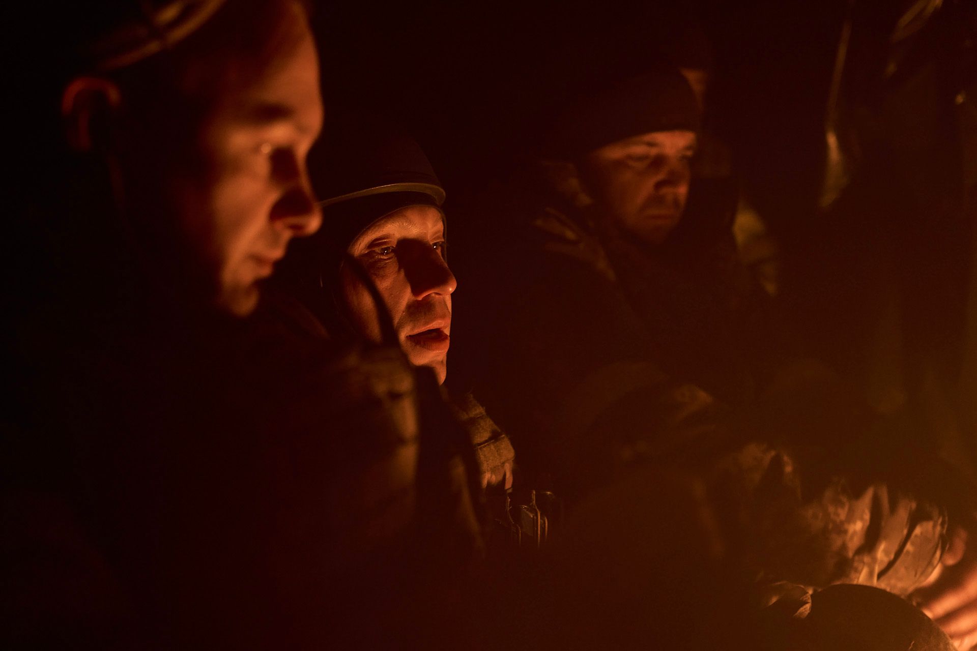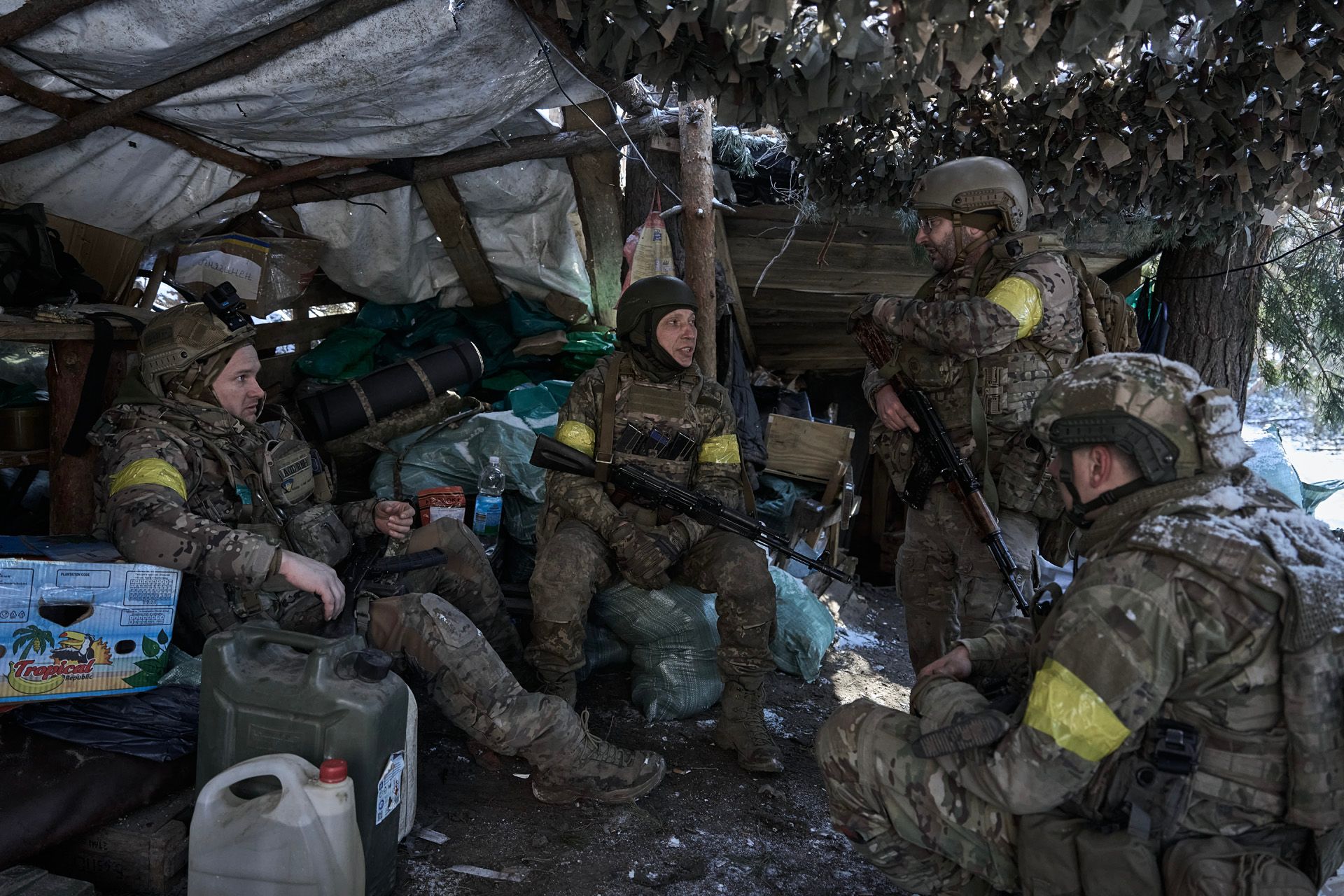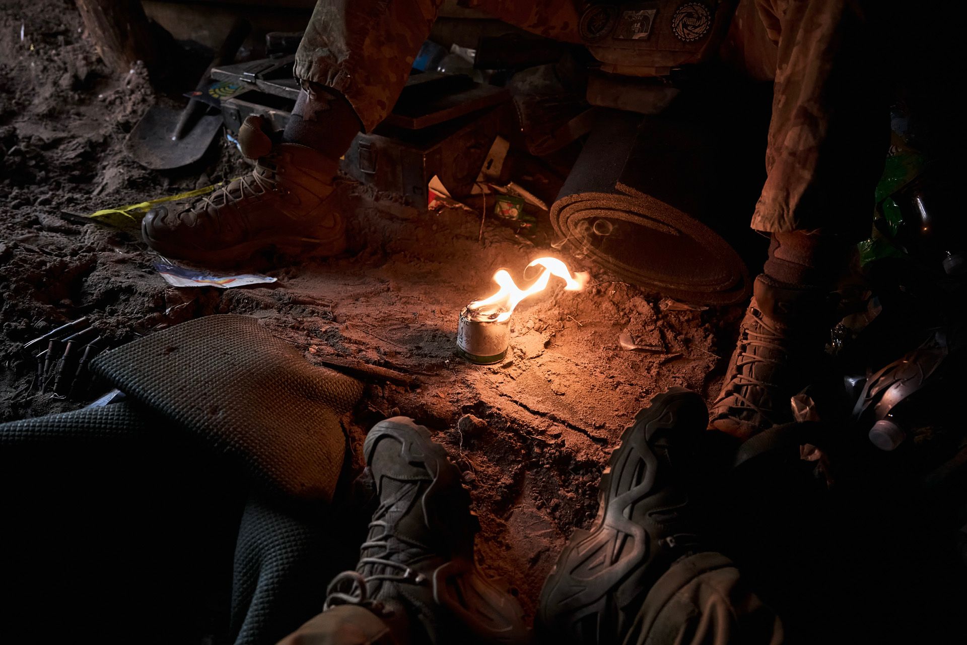 Kostiantyn Liberov / Libkos / Getty Images Бойцы «Эдельвейса» согреваются в землянке после штурма российских позиций в лесу под Синьковкой