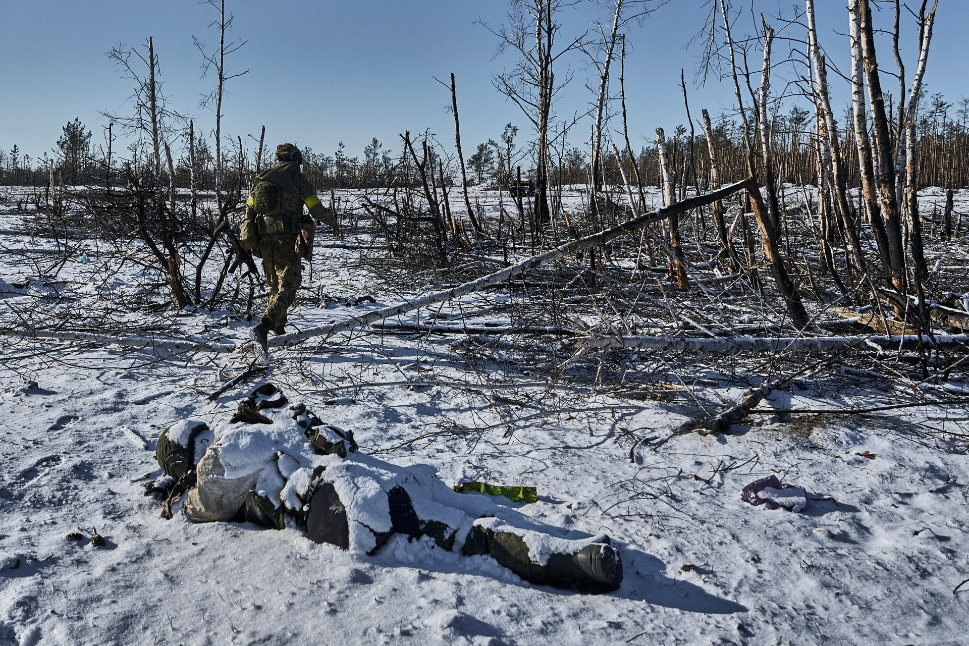 Kostiantyn Liberov / Libkos / Getty Images Боец «Эдельвейса» возвращается к позициям бригады по лесополосе после попытки штурма российских позиций под Синьковкой. На земле лежит занесенное снегом тело погибшего в бою военнослужащего