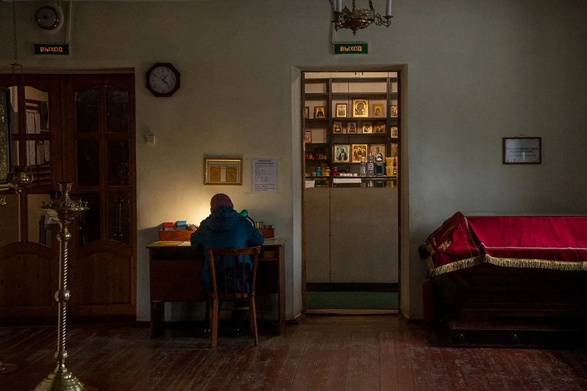 Недалеко от железной дороги — местный храм. Несмотря на выходной день, он пуст. Владимир, служащий при храме, сокрушается, что люди вспоминают о Боге в крайне редких случаях — похороны, венчание, крестины и еще по праздникам.