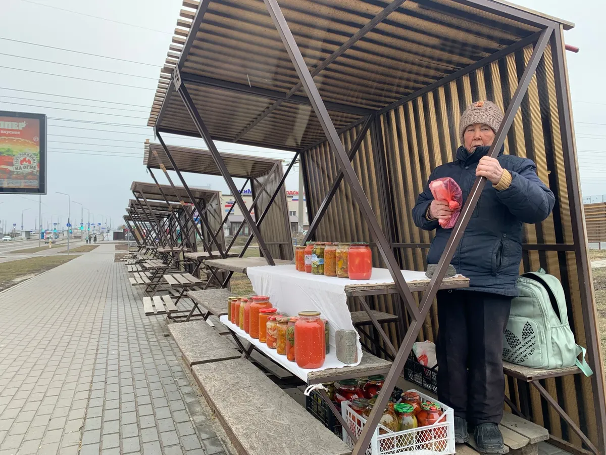 На обратном пути замечаю, что на уличных торговых рядах — таких же пустых, как и сам город — пожилая женщина расставляет соления на продажу. Лидия Алексеевна даже радуется, что может с кем-то поговорить.