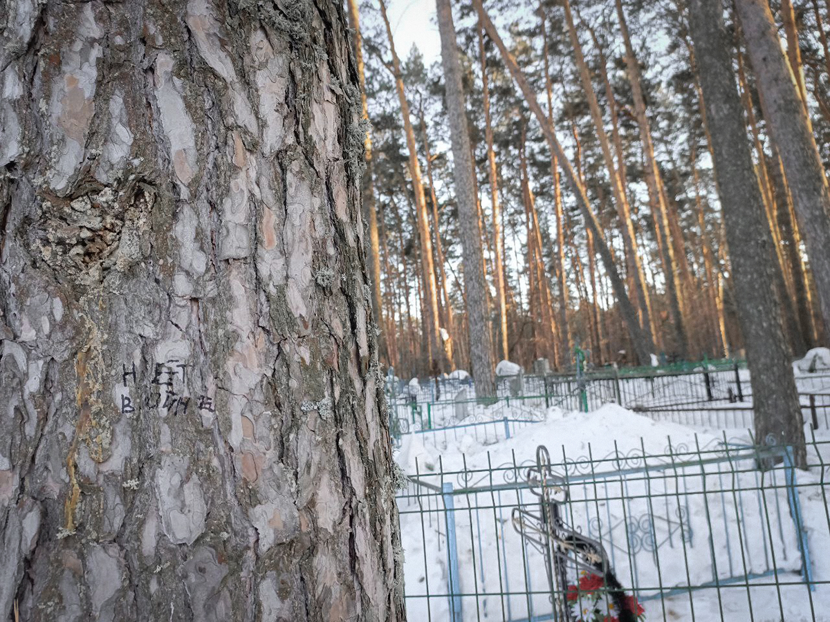 За церковью — кладбище. Там три свежие могилы бирюлинцев, погибших в Украине. Их можно узнать по воткнутым в землю российским флагам и пластиковым светильникам, имитирующим костер. На ограде одной из могил написано «За жизнь без войны» и криво нарисовано сердечко. На сосне посреди могил тем же черным цветом — «Нет войне».
