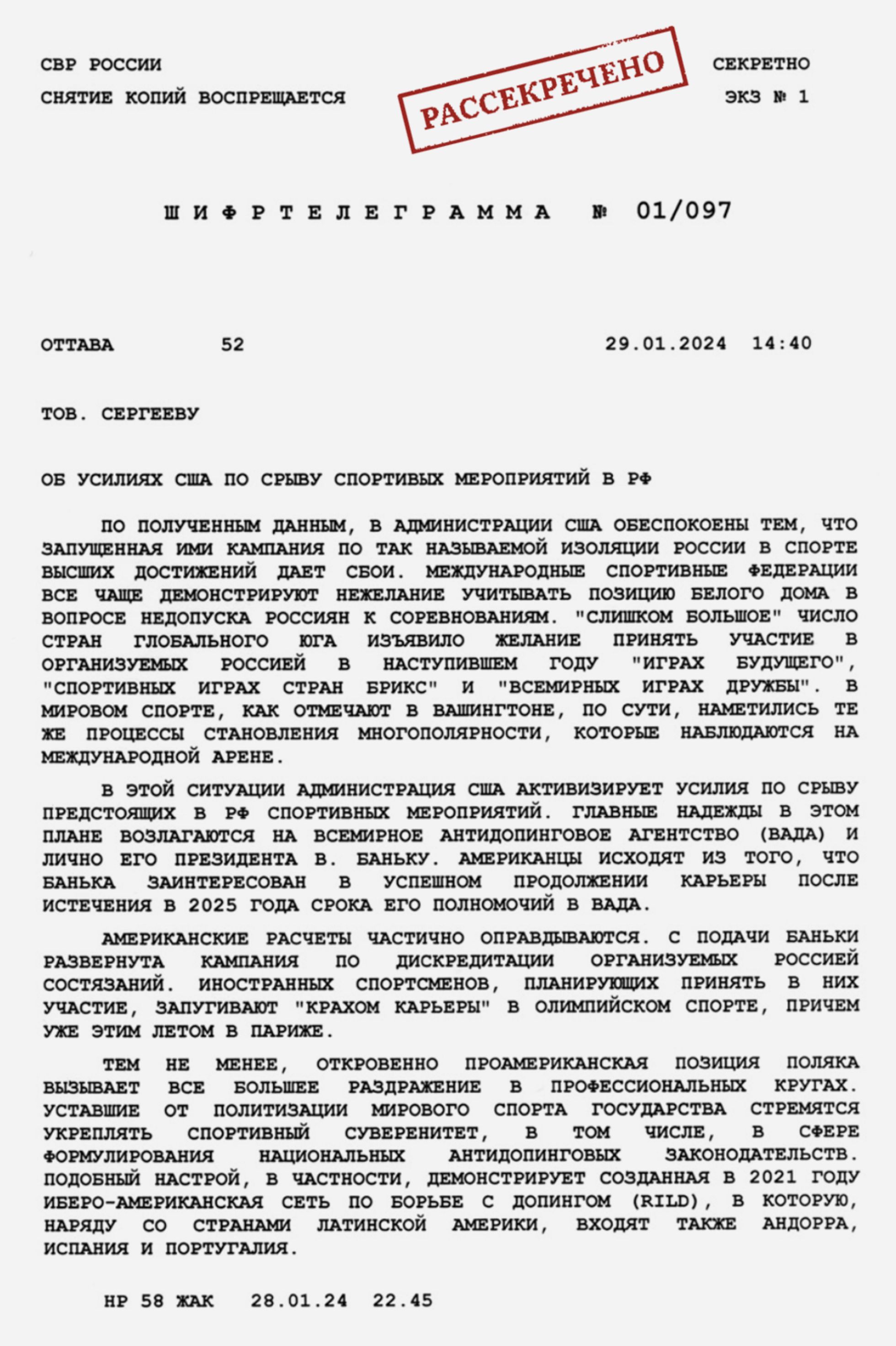 В этой ситуации администрация США активизирует усилия по срыву предстоящих в РФ спортивных мероприятий. Главные надежды в этом плане возлагаются на Всемирное антидопинговое агентство (ВАДА) и лично его президента В. Баньку. Американцы исходят из того, что Банька заинтересован в успешном продолжении карьеры после истечения в 2025 году срока его полномочий в ВАДА.