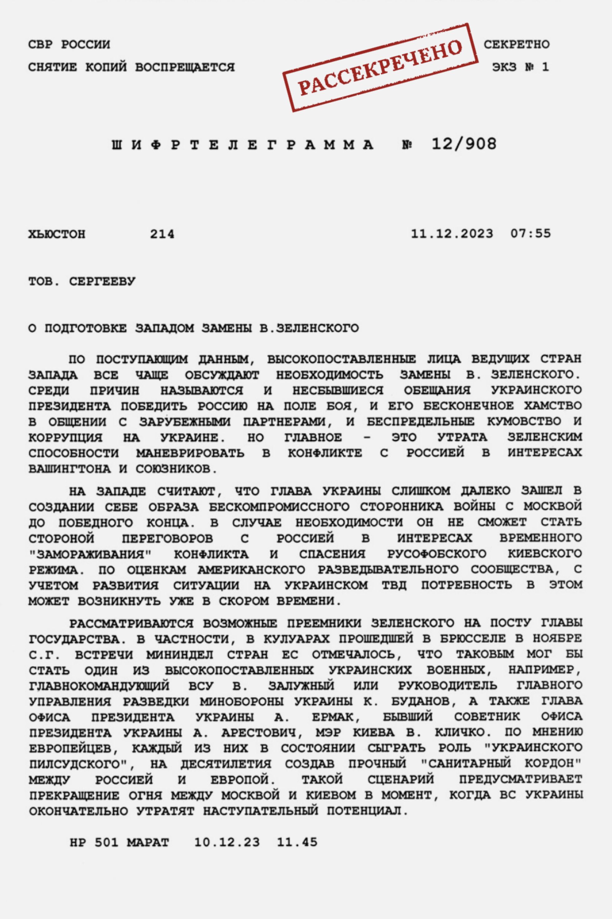 Глава Службы внешней разведки России Сергей Нарышкин с начала войны регулярно и публично рассказывает об антироссийских планах Запада, которые его ведомству якобы становятся известны из агентурных донесений. Все полученные Нарышкиным сведения при этом лежат строго в рамках любимого нарратива Владимира Путина о том, что Украина — марионетка в руках Запада, а США всеми силами ищут способы ослабить Россию, которая, в свою очередь, лишь хочет отстоять свой суверенитет. В мартовском номере ведомственного журнала «Разведчик» в разделе «Уполномочен заявить» СВР опубликовала, как утверждается, рассекреченные донесения агентов, на которые ссылался Нарышкин, — вероятно, спецслужба полагает, что такие доказательства должны развеять сомнения скептиков. Мы публикуем эти письма целиком и без комментариев.