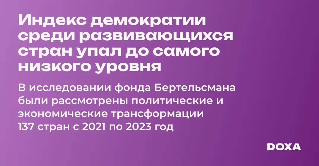 В исследовании фонда Бертельсмана (BTI) были рассмотрены политические и экономические трансформации 137 стран с 2021 по 2023 год. Один из выводов: на 63 демократических режима приходится 74 автократии. Автор:ки исследования также отметили экономическое неравенство и провал экономической политики во многих развивающихся странах.
