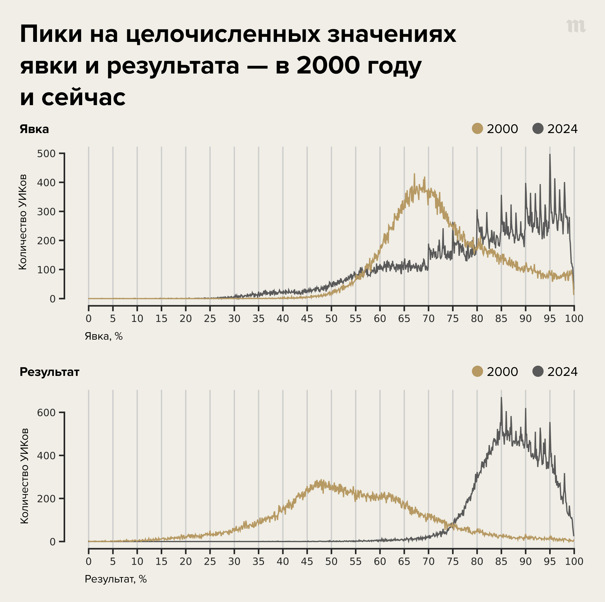 Нынешнюю ситуацию полезно сравнить и с выборами 2000 года. Теми самыми, на которых был впервые избран Владимир Путин и которые стали последними президентскими выборами в России без пиков рисованных протоколов. Здесь четко видно, что аргументы о том, что Россия слишком особенная страна, к которой неприменимо нормальное распределение явки, не выдерживают никакой критики: хотя исходное распределение действительно имеет особенности, страна на двух графиках не изменилась — изменились принципы подсчета голосов.