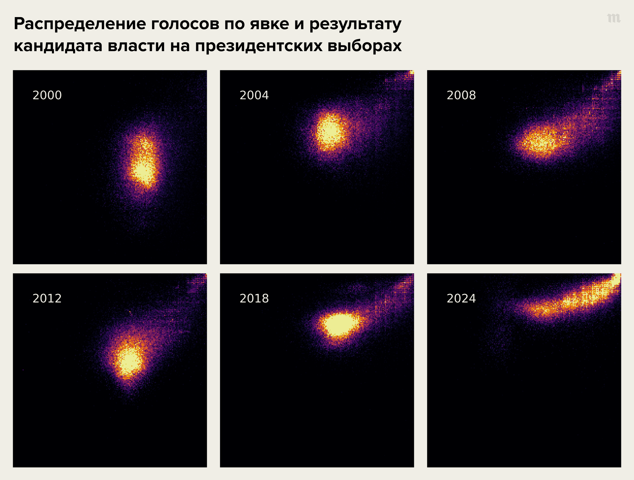 Чтобы количественно оценить, насколько ухудшилась ситуация с такими фальсификациями при подсчете голосов на нынешних «выборах», мы воспроизвели анализ Кобака, Шпилькина и Пшеничникова уже с новыми данными, собранными Иваном Шукшиным. На графике ниже приведено распределение избирательных участков по явке и результату на нынешних и предыдущих президентских выборах.