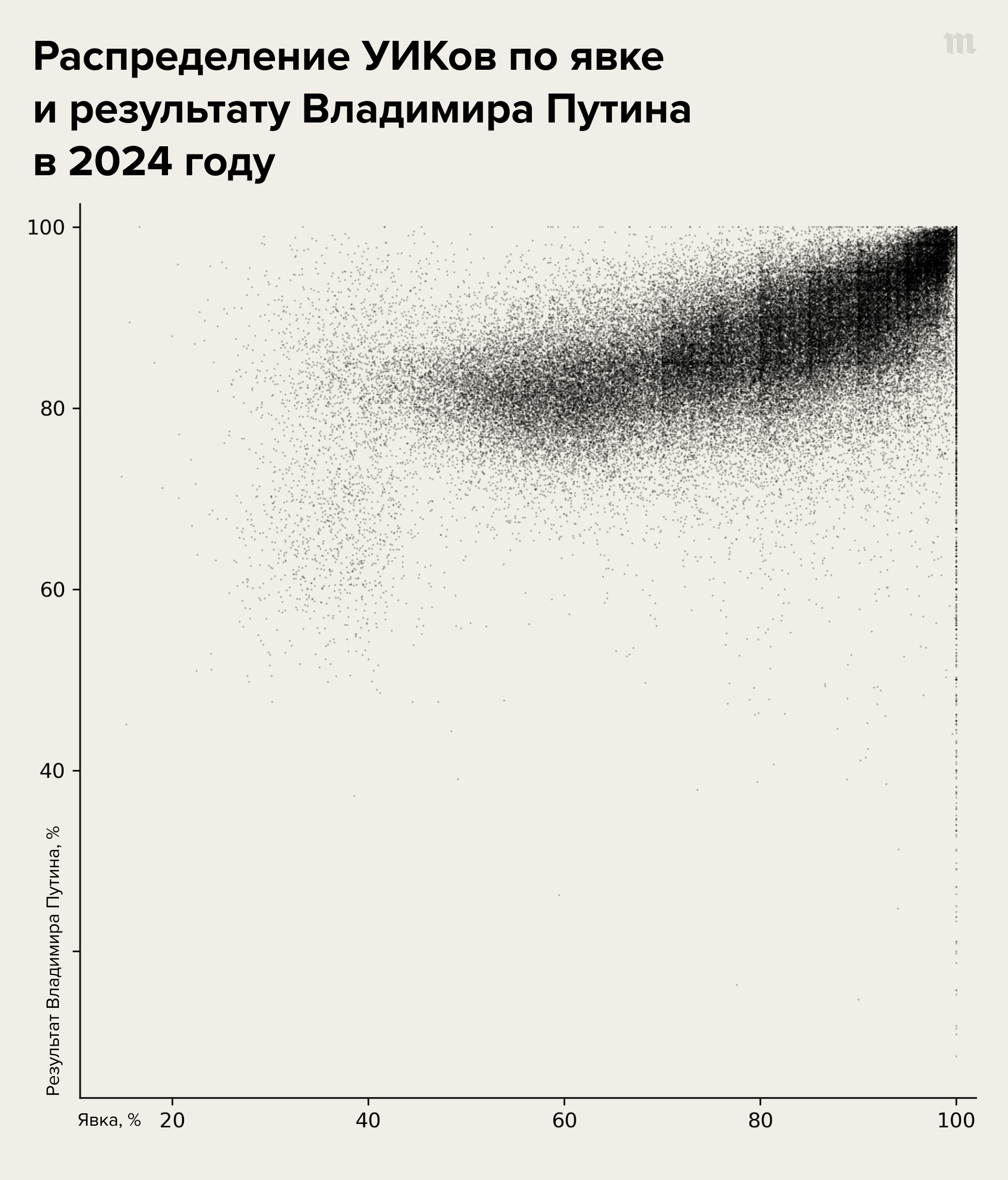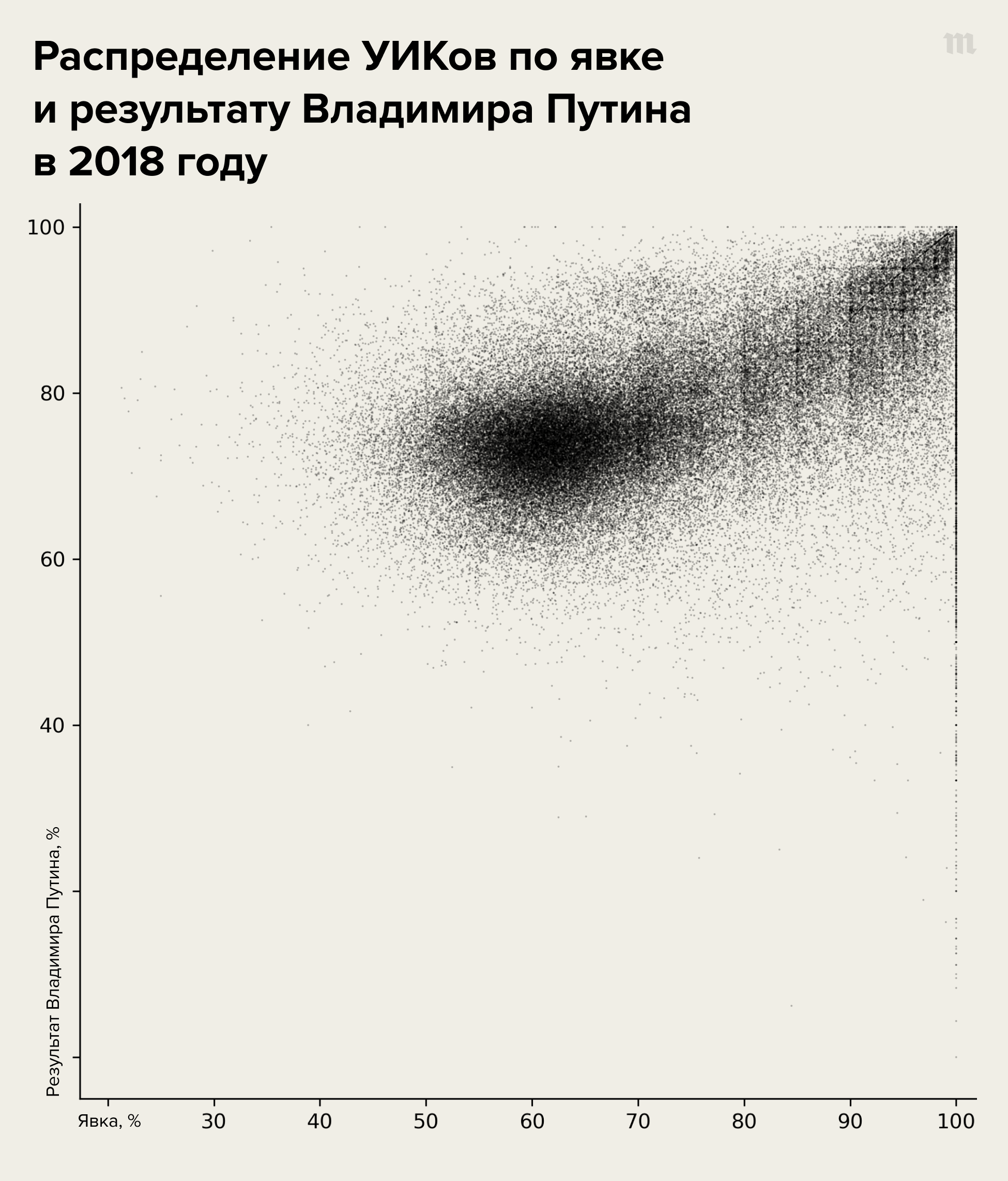 Вот как выглядело такое двумерное распределение УИК по явке и результату Владимира Путина на прошлых президентских выборах 2018 года.