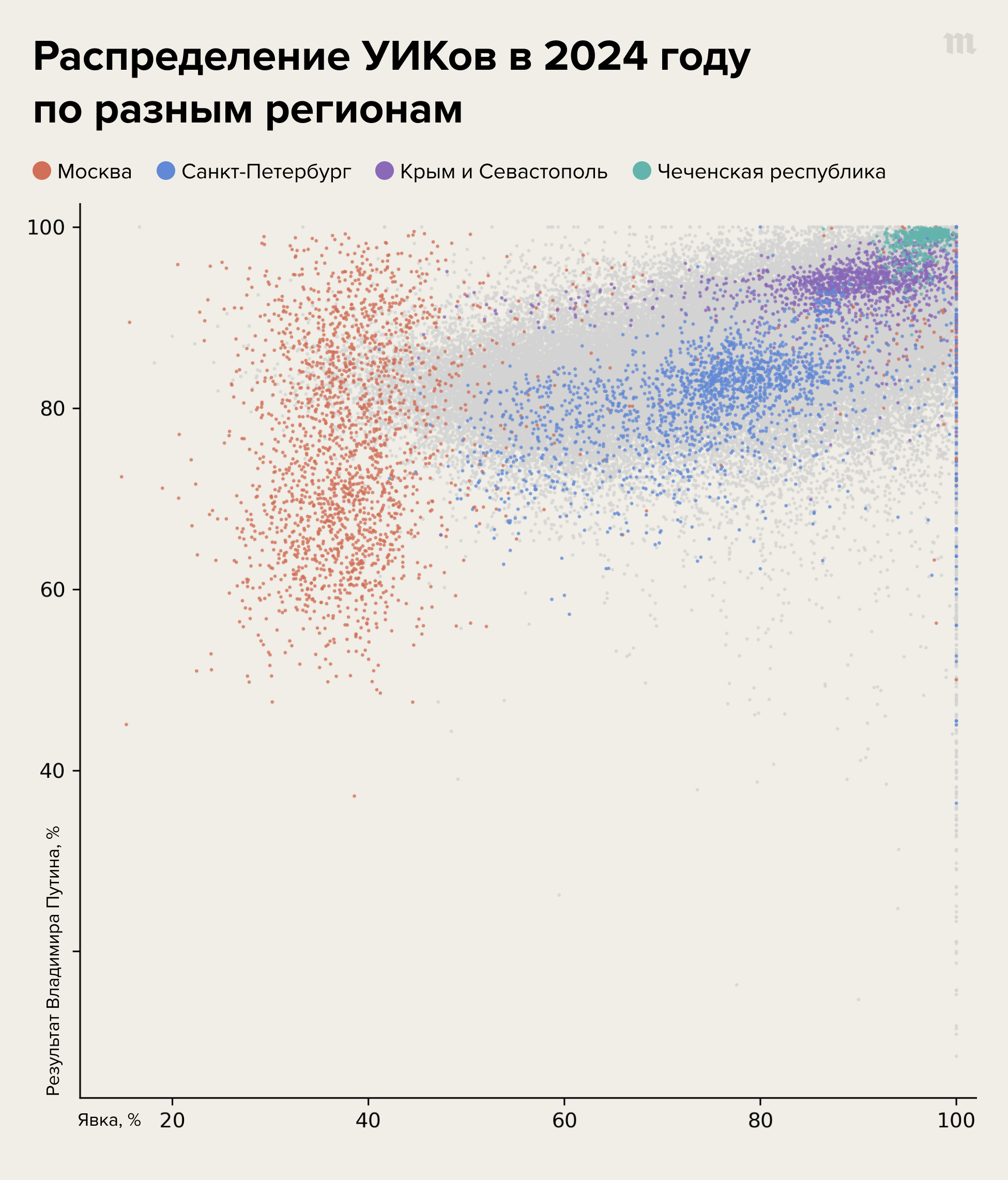 В Санкт-Петербурге при этом картина принципиально иная — здесь вовсе нет кластера участков со средней явкой, а наблюдается практически «чистый» хвост кометы (а также «ступеньки» отдельных УИК, где результаты явно были просто нарисованы). Аналогичная — но еще более выраженная — картина видна в аннексированных Крыму и Севастополе.