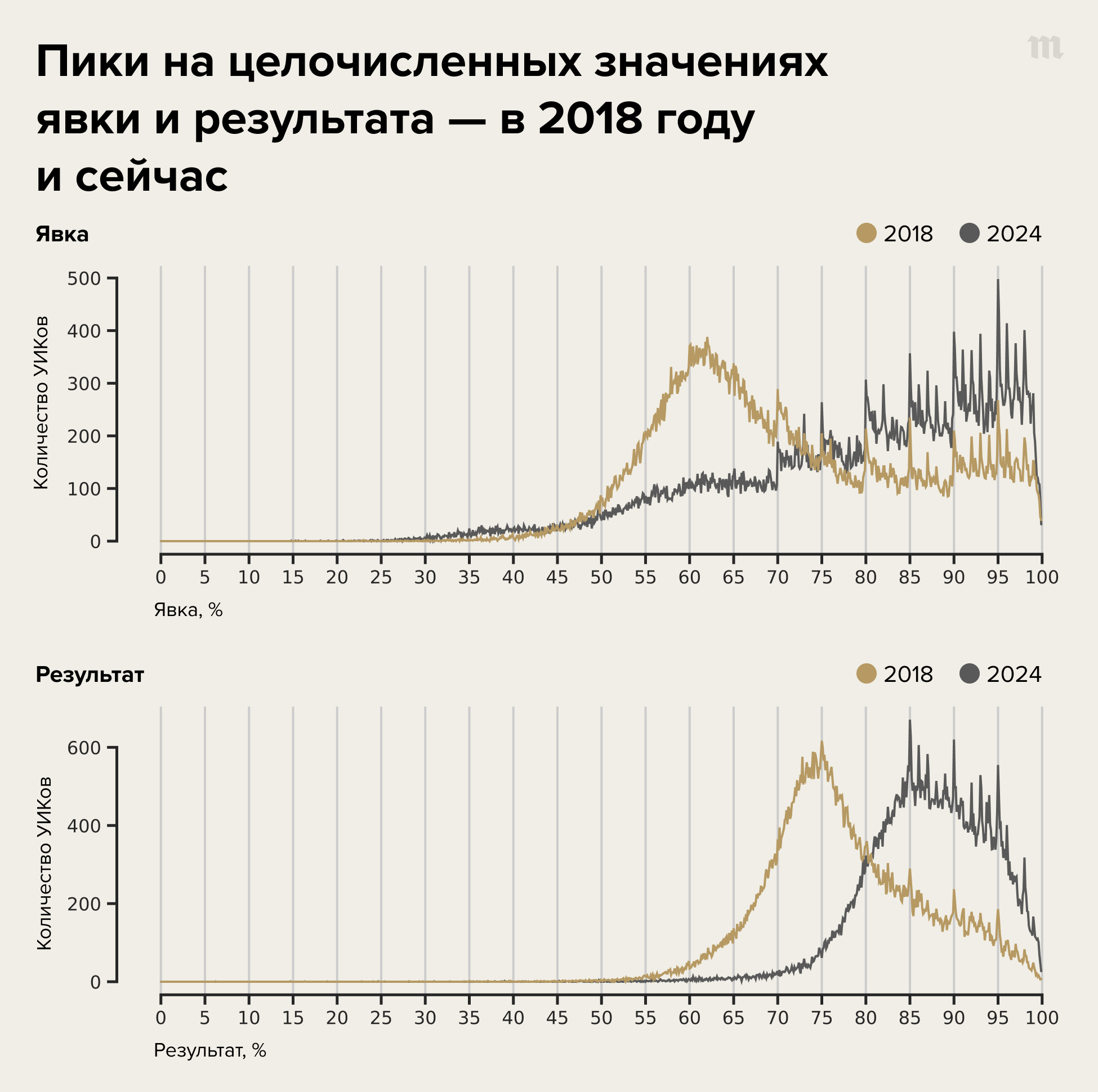 Две главные аномалии, которые характерны для почти всех выборов в России в последние десятилетия, — это корреляция результатов лидера голосования с явкой и пики на круглых значениях явки и результата. И на этот раз масштаб обеих аномалий достиг рекордных значений.