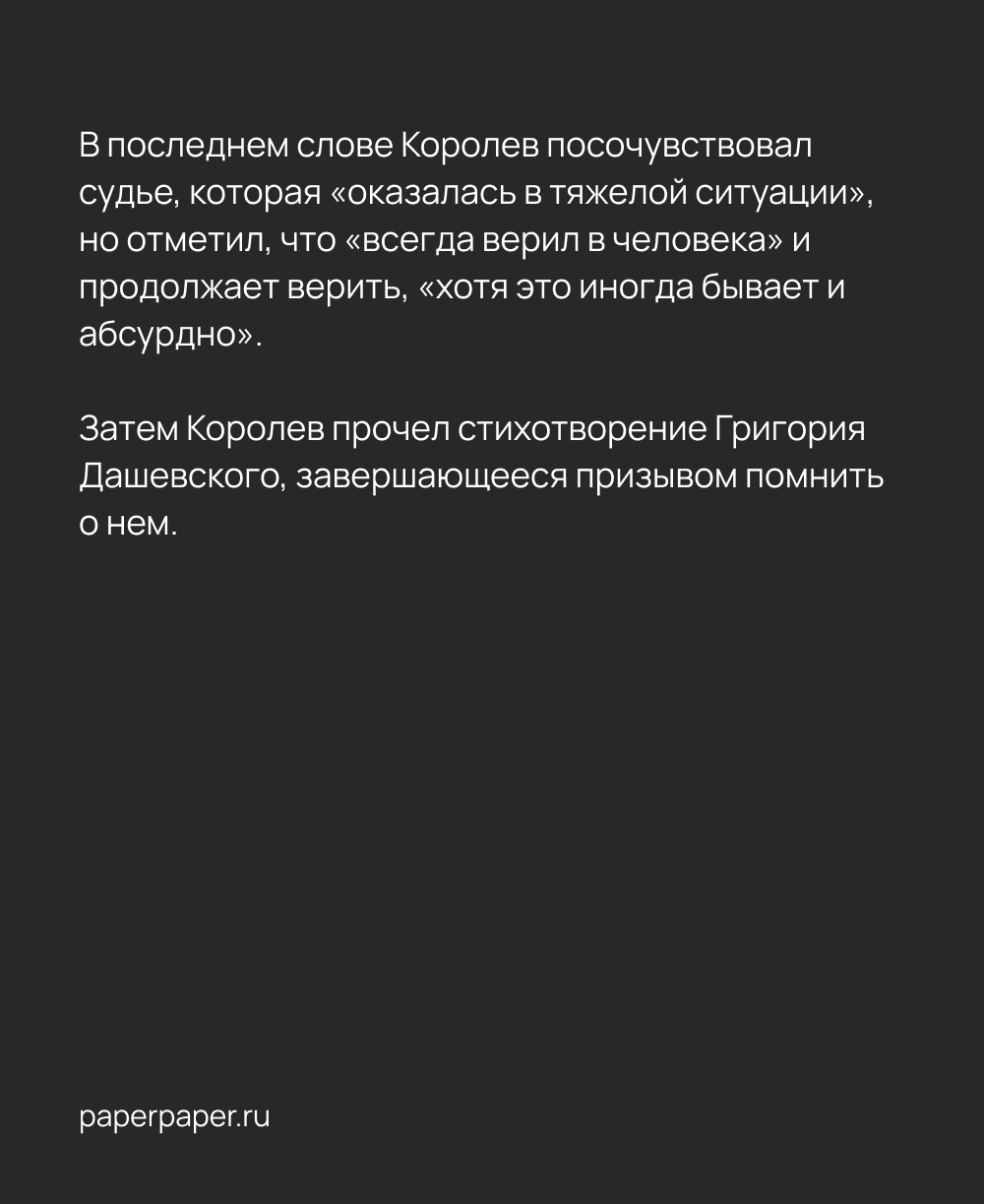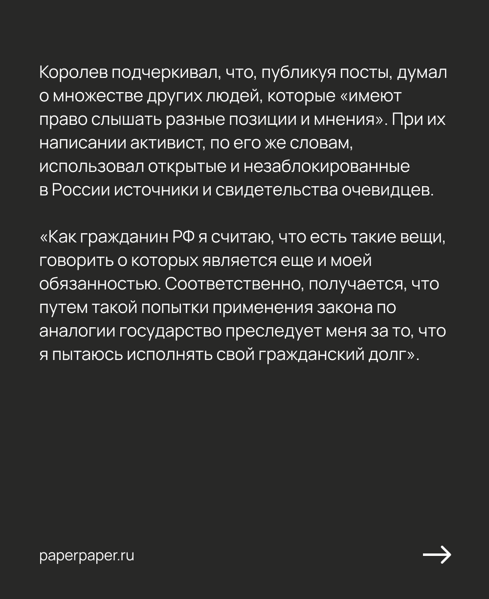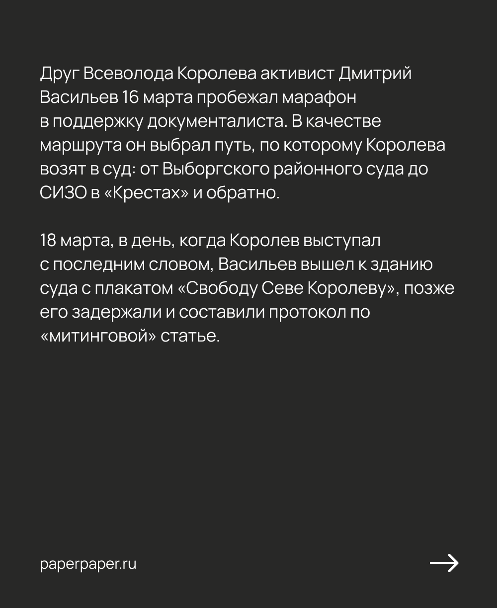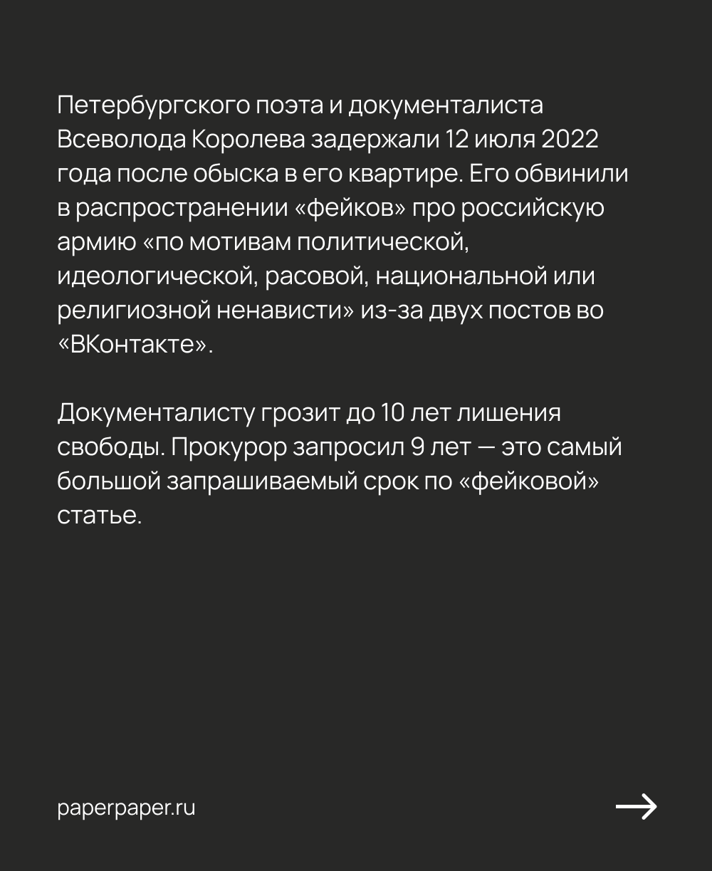 20 марта Выборгский районный суд Петербурга должен вынести приговор документалисту Всеволоду Королеву. Его обвиняют в распространении «фейков» об армии. Дело Королева рассматривали рекордно долго — уже 20 месяцев он находится в СИЗО.