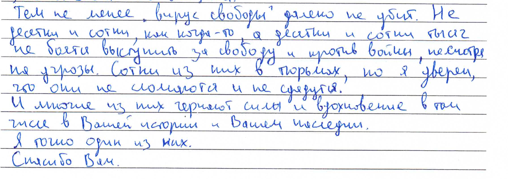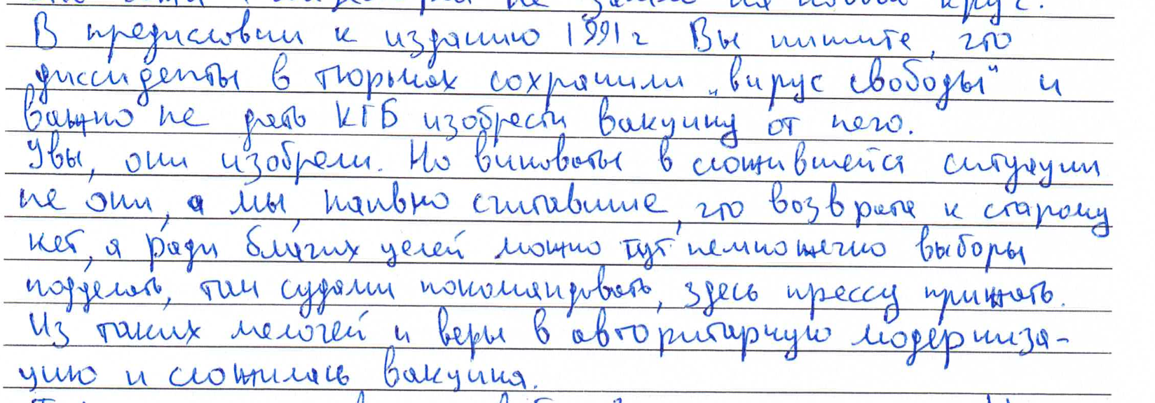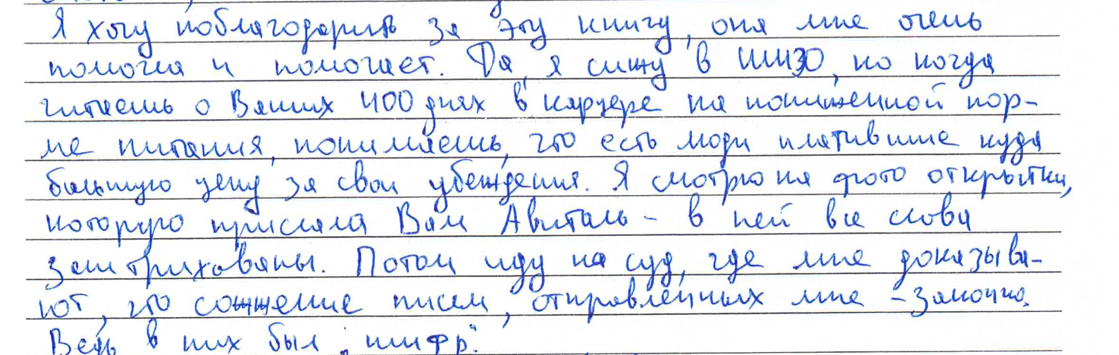 Я написал ответ немедленно, и он уже шел пару недель, потому что письмо может быть передано [заключенному], только когда адвокат получит свидание. Так началось эта короткая, но очень значимая для меня переписка.