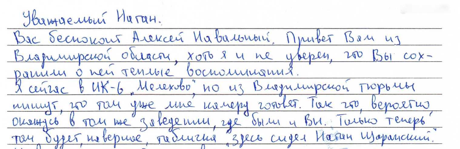 — Довольно неожиданно для меня. Один раввин, будучи в Израиле, позвонил моей помощнице [3 апреля 2023 года] и сказал, что у него есть письмо от Алексея Навального для Натана Щаранского. Что было удивительно [учитывая, что он находится в колонии]: письмо, написанное утром, поздно вечером было у меня. То есть адвокат его вынес, переслал раввину, раввин переслал [моей помощнице] Ларисе, Лариса — мне. Все это произошло в течение нескольких часов.