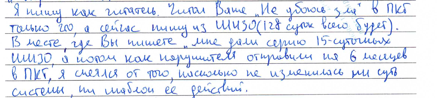 Кроме того, я очень хорошо чувствовал, что чувствует человек, которого прессуют с помощью ШИЗО, так как в свое время гордился тем, что у меня абсолютный рекорд по ШИЗО [405 дней за девять лет]. А тут я вижу, что человека прессуют даже больше, чем меня, и он остается [внутренне] свободным.